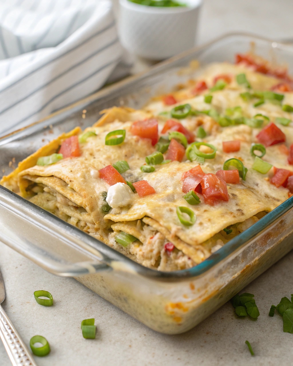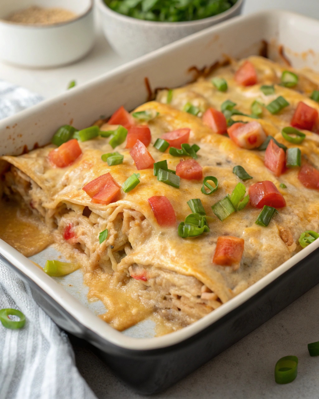 Layering the tortillas with the chicken mixture, cheese, tomatoes, and green onions creates a stacked enchilada casserole that bakes into a bubbling, melty, golden masterpiece. The addition of fresh produce like Roma tomatoes and green onions adds brightness that balances the richness of the creamy sauce.