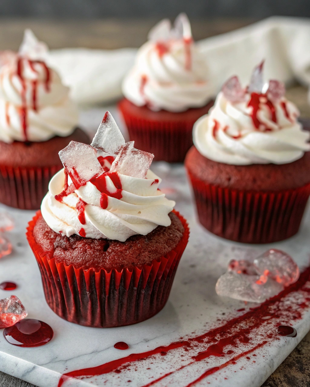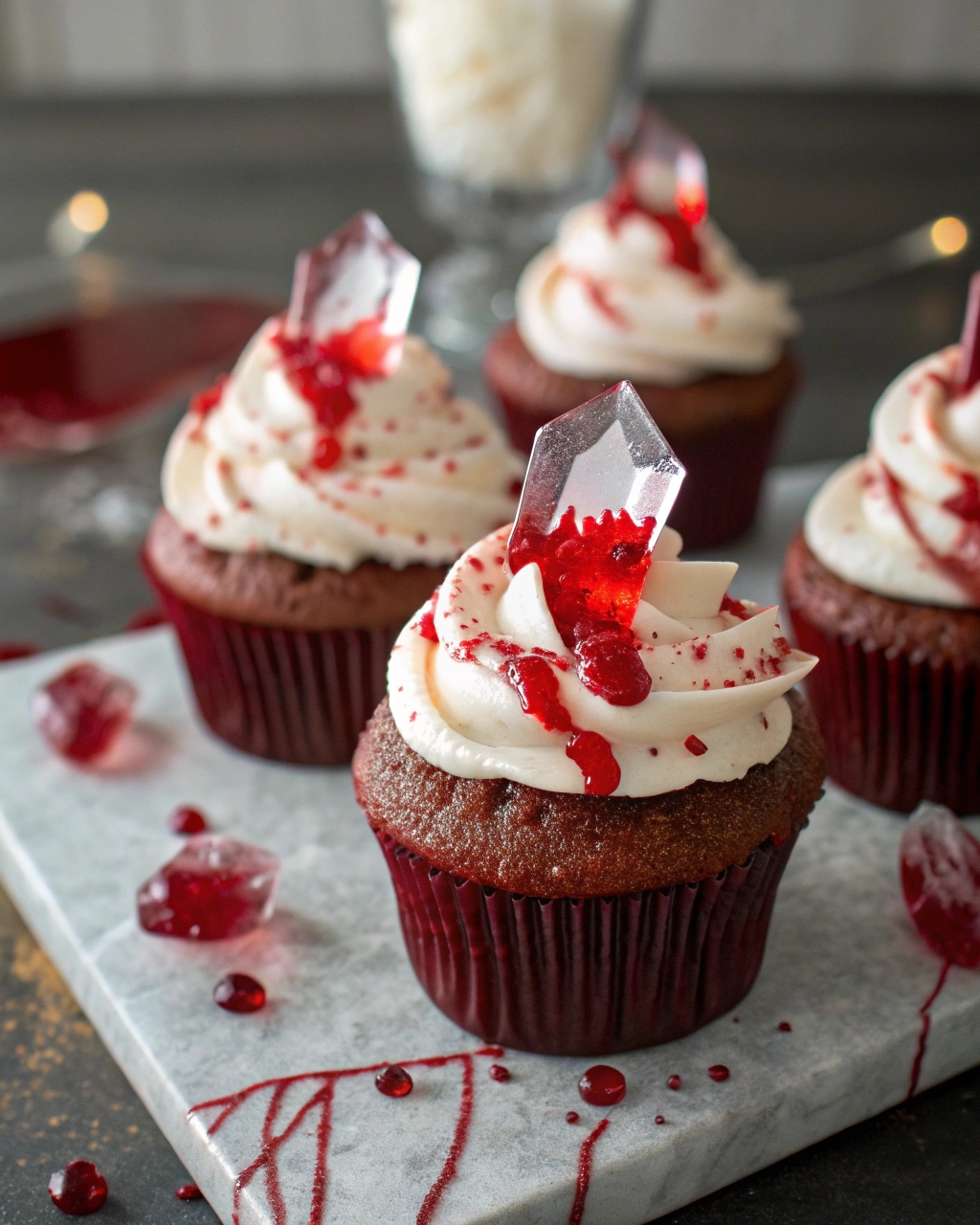 These cupcakes aren’t just a showstopper — they’re the kind of dessert that guests remember. The rich red cake contrasts perfectly with silky white frosting, while the homemade sugar glass and fake blood topping add a touch of theatrical fun. They’re great for Halloween gatherings, themed bake sales, or just a weekend of spooky baking at home.