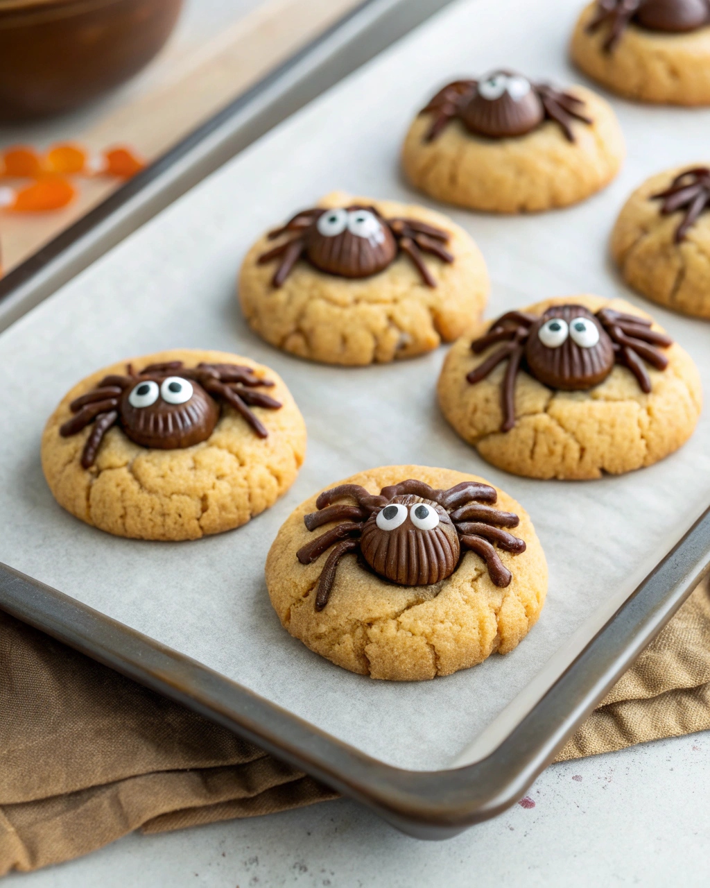 Freezing the mini peanut butter cups before baking is another pro tip — it keeps them perfectly formed when pressed into the warm cookies, creating that signature “spider body” look. Once cooled, a drizzle of melted chocolate forms the legs, and candy eyes bring the spooky-cute personality to life.