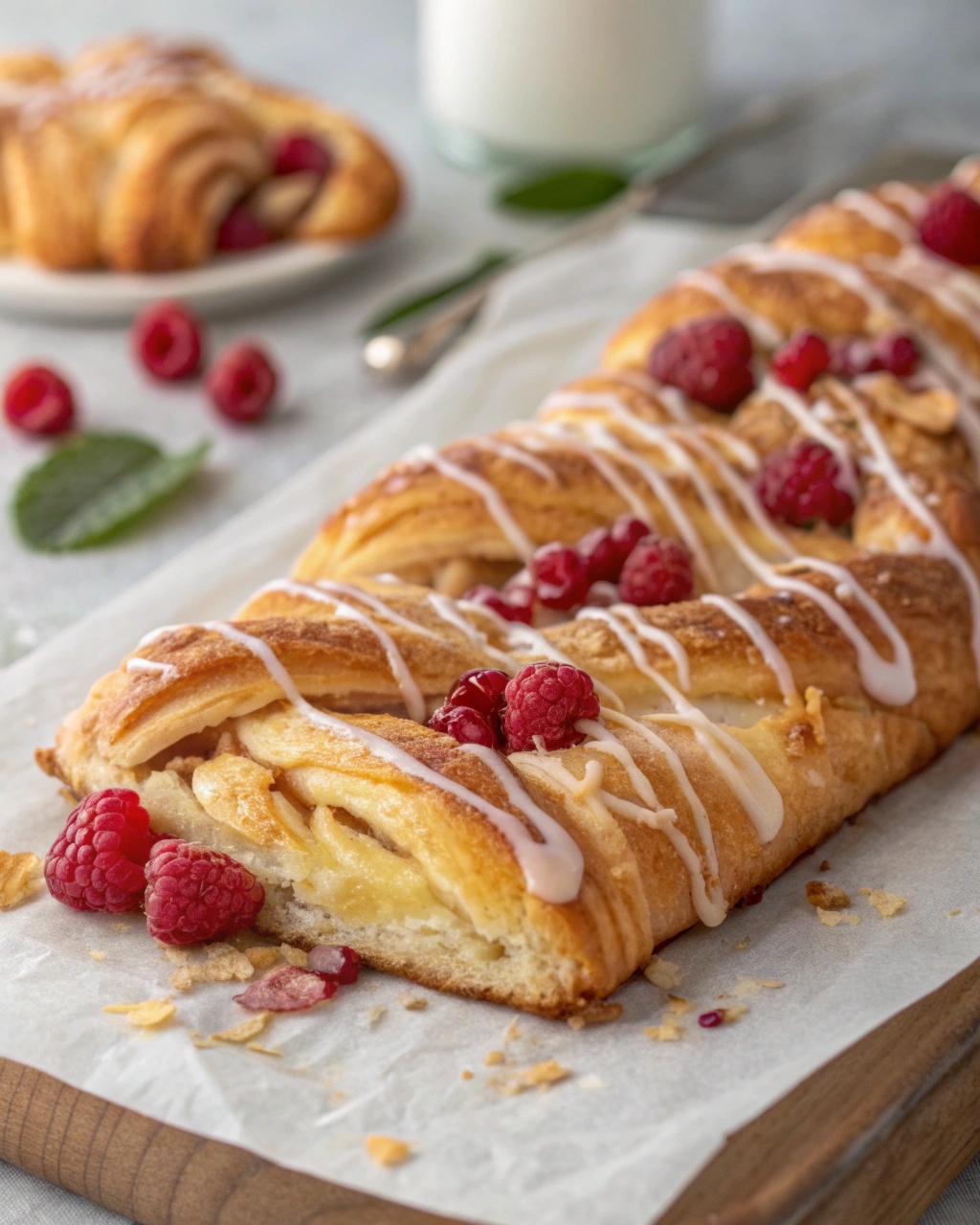 This raspberry Danish braid combines eye-catching presentation with incredible flavor. The homemade pastry dough bakes into tender, flaky layers, while the raspberry filling adds a fresh, fruity contrast. The vanilla glaze ties everything together with just the right touch of sweetness. It’s a versatile recipe that can be made ahead, frozen, and customized with different fillings, making it ideal for entertaining or weekend baking.