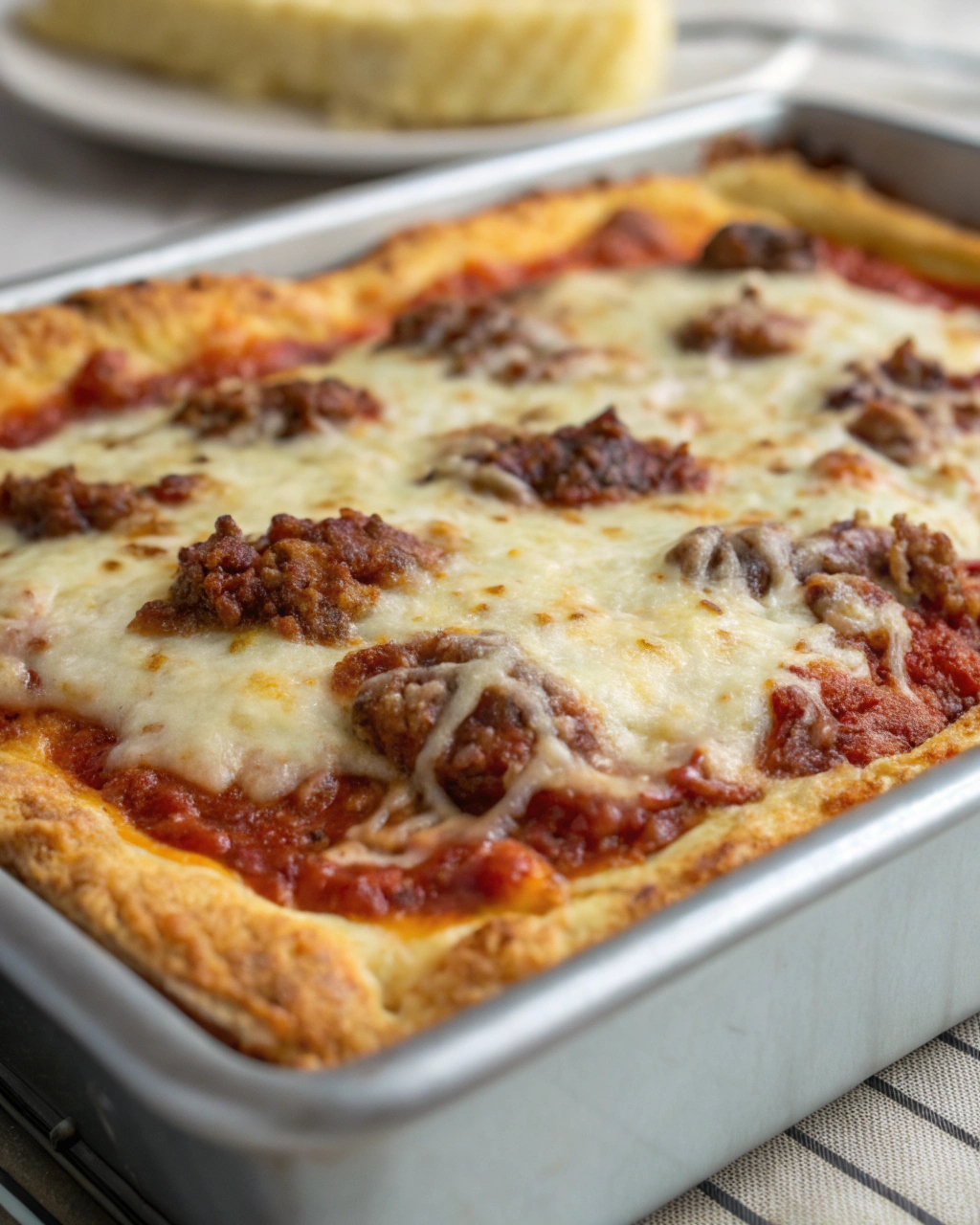 One of the best parts of this casserole is the refrigerated pizza dough topping. As it bakes, it becomes golden and slightly crisp on the outside while staying soft and chewy inside, just like fresh pizza crust.