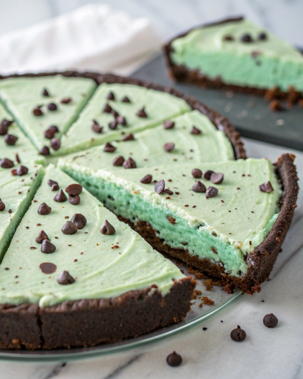 Once the filling is spread evenly over the chilled crust, the remaining chocolate chips are sprinkled on top, adding a decorative and crunchy layer. The pie is then chilled for at least 4 hours (or overnight for best consistency). As it cools, the flavors meld—the mint becomes more nuanced, the cream cheese firms slightly, and the crust stays crisp. When sliced, you’ll see a clean contrast: the deep chocolatey crust and the pale green filling speckled with chocolate chips. Each bite gives you a smooth, minty cream with chocolate surprises and a solid buttery base.