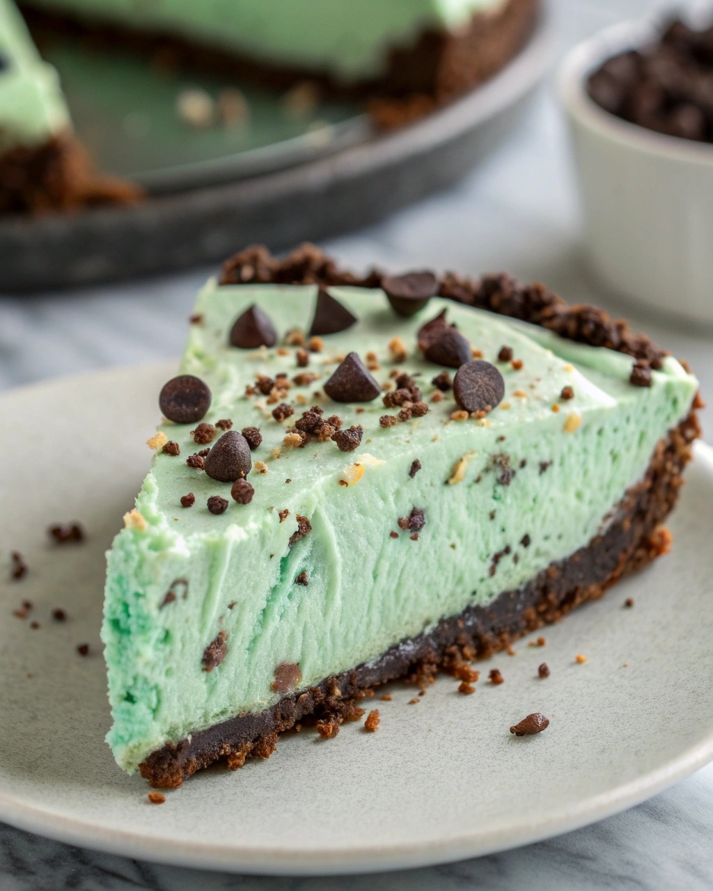 Once the filling is spread evenly over the chilled crust, the remaining chocolate chips are sprinkled on top, adding a decorative and crunchy layer. The pie is then chilled for at least 4 hours (or overnight for best consistency). As it cools, the flavors meld—the mint becomes more nuanced, the cream cheese firms slightly, and the crust stays crisp. When sliced, you’ll see a clean contrast: the deep chocolatey crust and the pale green filling speckled with chocolate chips. Each bite gives you a smooth, minty cream with chocolate surprises and a solid buttery base.