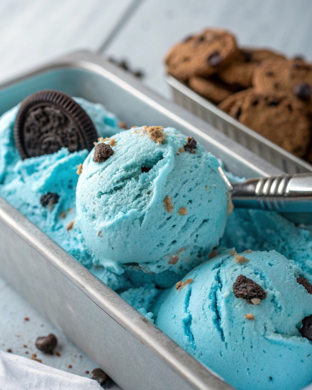 Freeze the entire pan for at least 5 hours (or overnight) until firm. Because there’s no churning, the texture is dense yet creamy, with cookie chunks evenly embedded rather than sank to the bottom. When you scoop it, you see cookie streaks, chips, and the vibrant blue background—a visual spectacle. Each bite is a melange: lush cream, cookie crunch, chocolate bursts, and playful color.