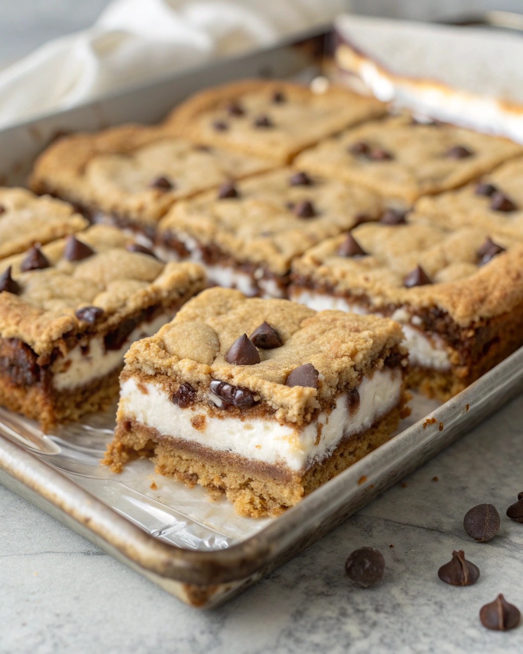 The trick is preserving the gooey quality of the marshmallow layer while ensuring the top cookie dough layer bakes through without burning. So you spoon or scoop remaining dough, pressing it gently over the marshmallow layer to create a patchwork cover—some crust showing, some dough overlapping—rather than a full seal. As the bars bake at 350°F, the top layer browns gently, edges become crisp, and the middle remains soft and slightly jiggly until cooled. Once cooled, the bars firm enough to slice but remain gooey within.