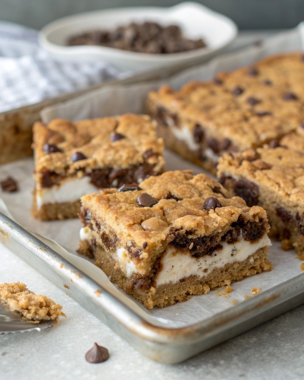 The trick is preserving the gooey quality of the marshmallow layer while ensuring the top cookie dough layer bakes through without burning. So you spoon or scoop remaining dough, pressing it gently over the marshmallow layer to create a patchwork cover—some crust showing, some dough overlapping—rather than a full seal. As the bars bake at 350°F, the top layer browns gently, edges become crisp, and the middle remains soft and slightly jiggly until cooled. Once cooled, the bars firm enough to slice but remain gooey within.