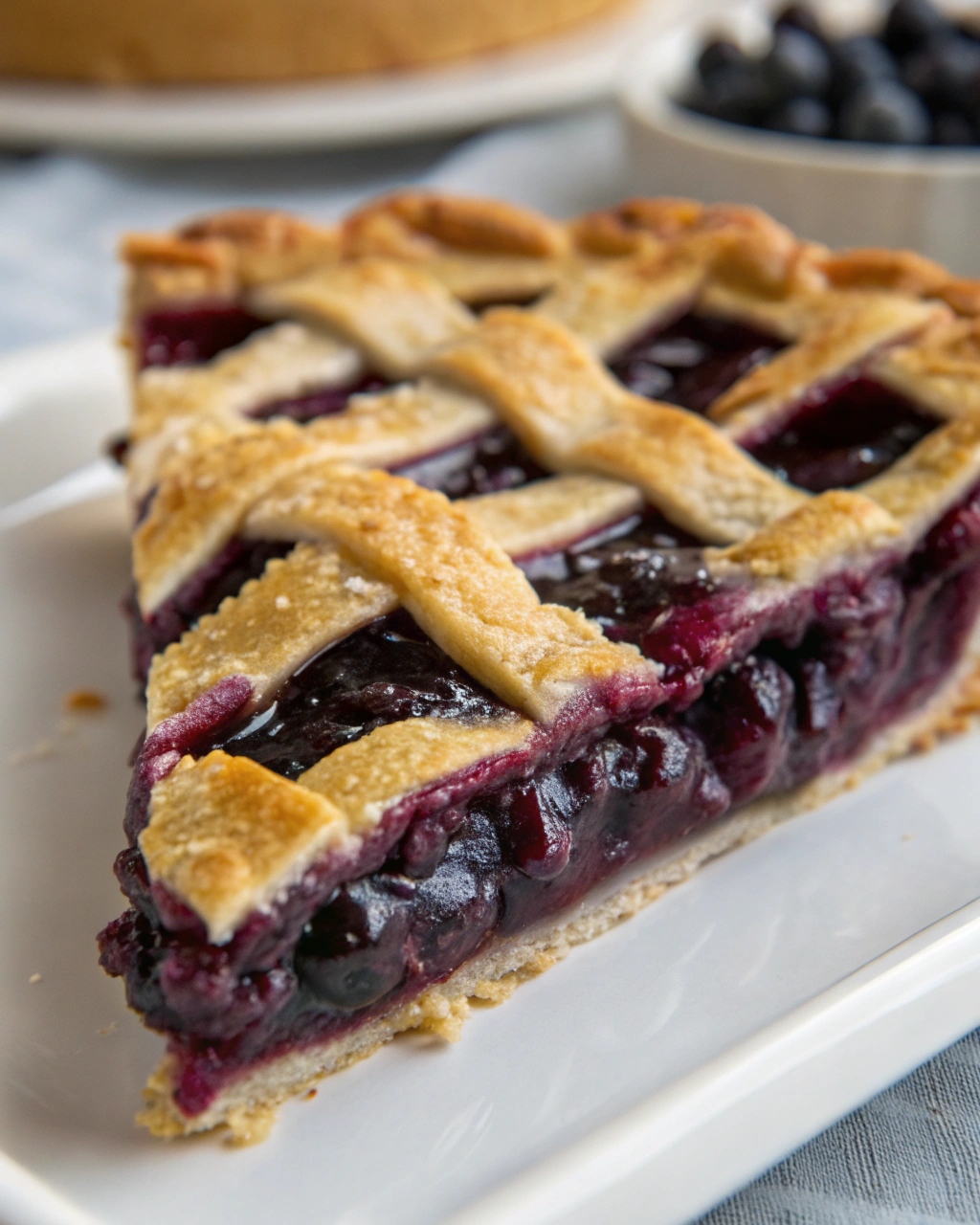 The use of cornstarch as a thickener is important. It helps the filling set properly without making it cloudy or overly stiff. When baked long enough, the cornstarch activates and turns the blueberry juices into a smooth, gel-like consistency that slices cleanly while remaining soft and luscious.