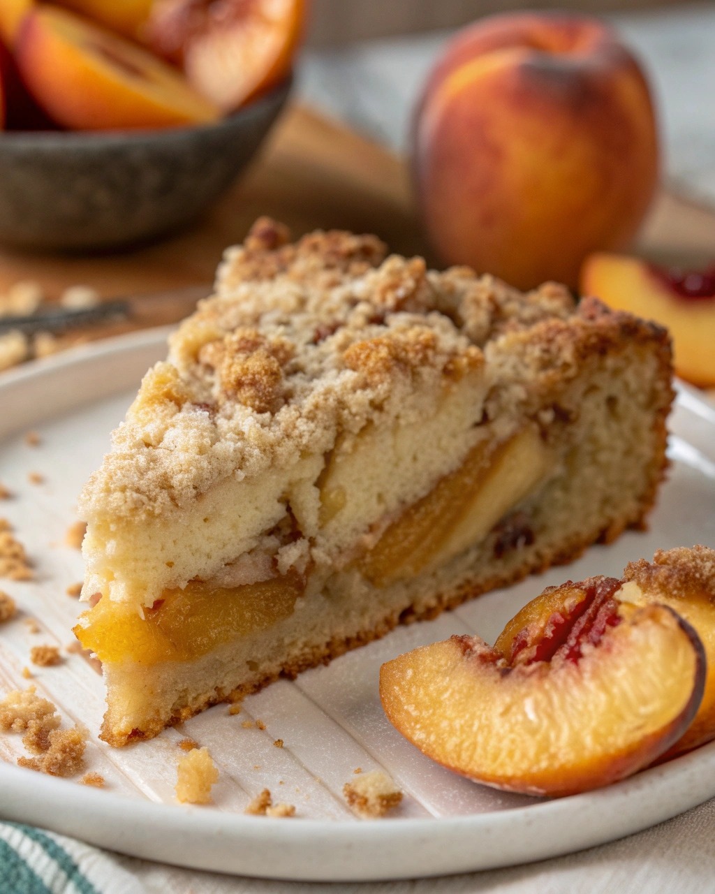 Because peaches are versatile, you can substitute other fruits in season (apricots, plums) if peaches aren’t available. The glazes and crumbs are forgiving, and the cake holds well for a day or two. Serve with coffee, tea, or a dollop of whipped cream for extra indulgence.