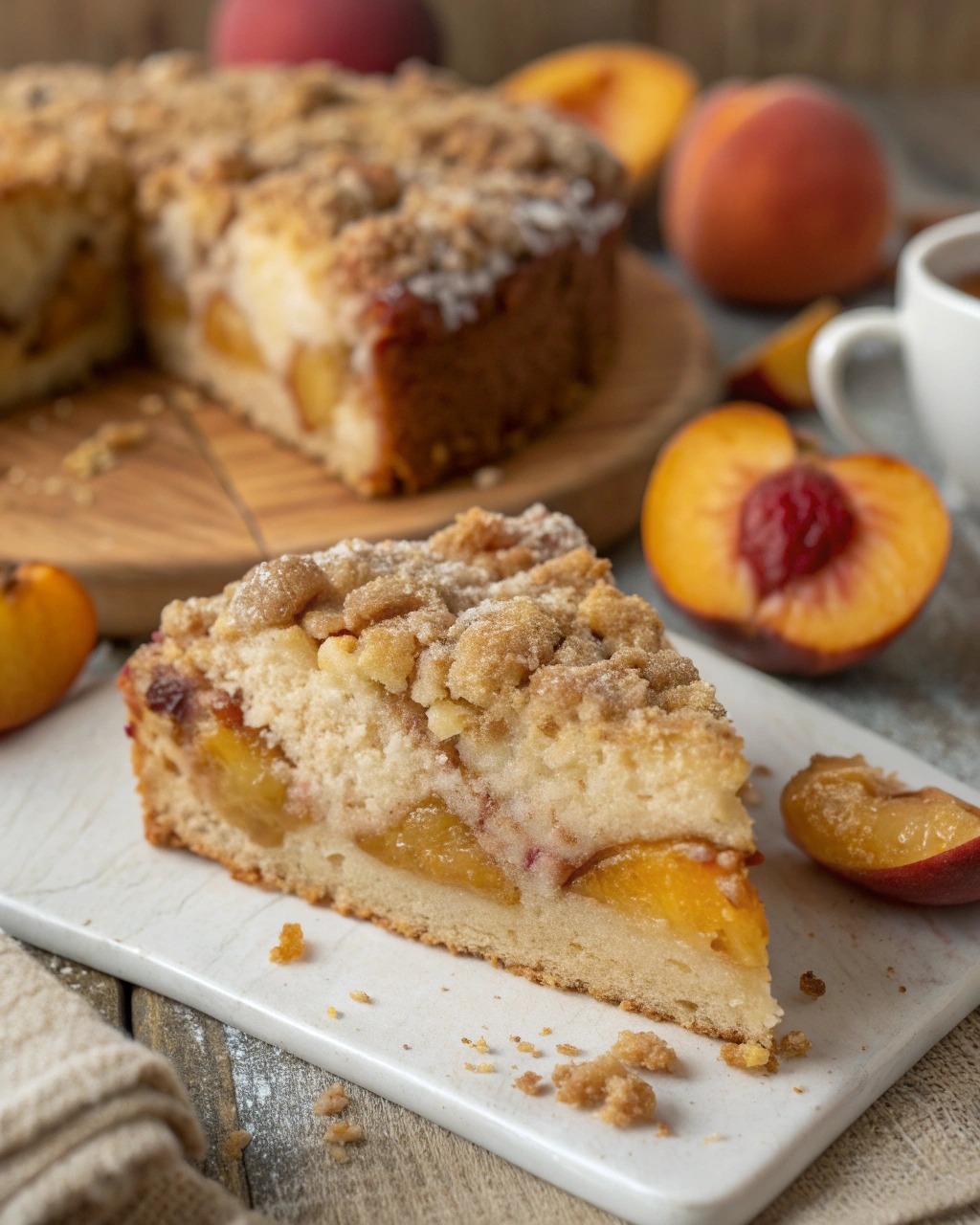 Because peaches are versatile, you can substitute other fruits in season (apricots, plums) if peaches aren’t available. The glazes and crumbs are forgiving, and the cake holds well for a day or two. Serve with coffee, tea, or a dollop of whipped cream for extra indulgence.