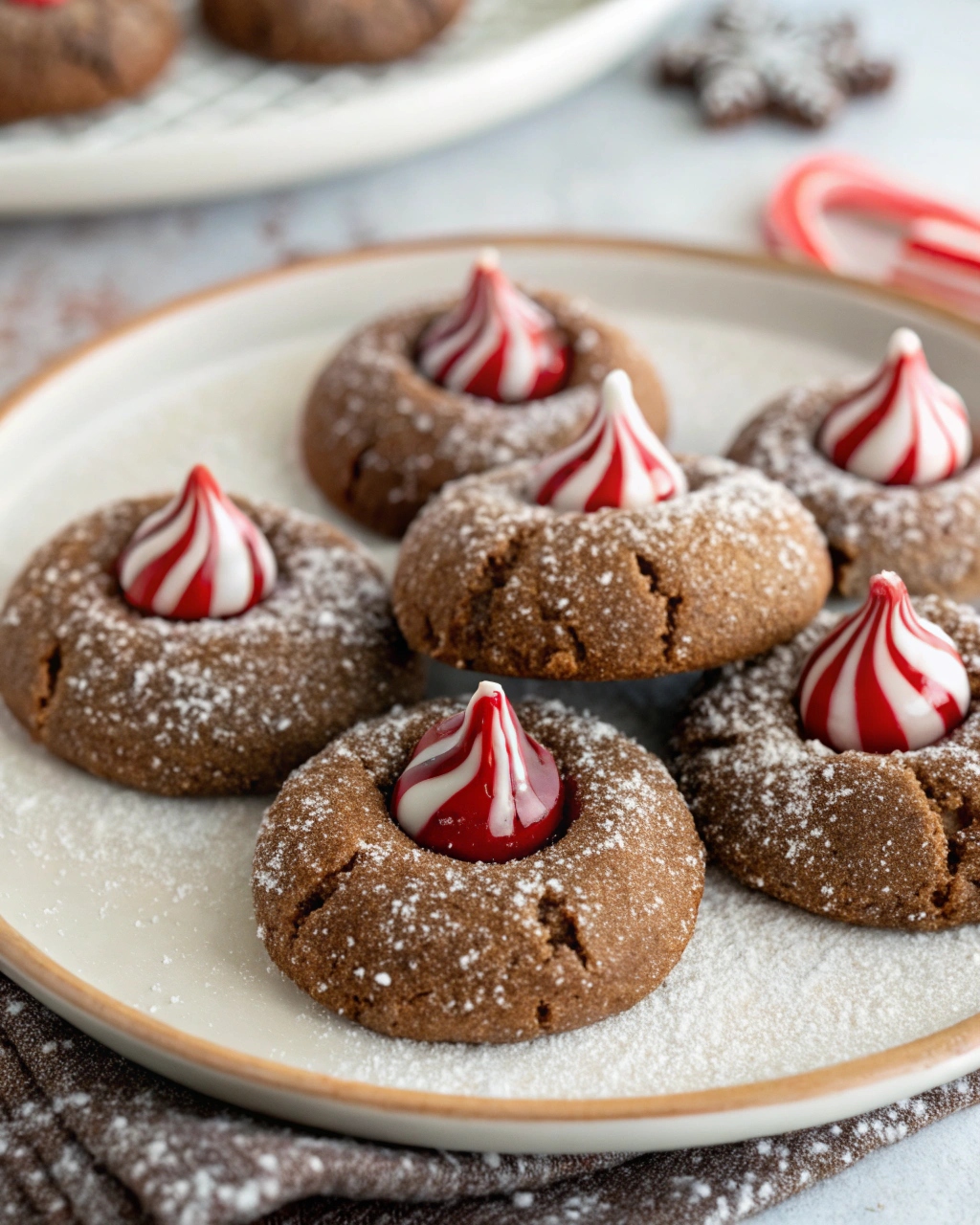 The base cookie is made with cocoa powder, giving it a deep chocolate flavor that pairs beautifully with the sweetness of the Candy Cane Hershey’s Kiss pressed on top. The texture is soft and chewy on the inside with a slight crisp along the edges, making each bite melt in your mouth. It’s a classic thumbprint cookie with a holiday twist.