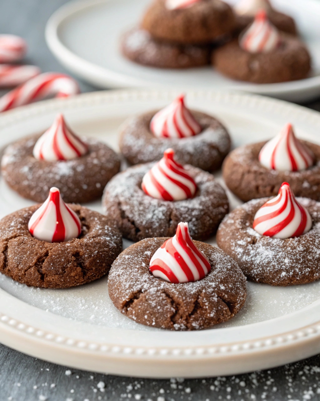 Peppermint Chocolate Thumbprint Cookies are soft, chewy, cocoa-rich cookies rolled in sugar and topped with creamy peppermint candy cane kisses. They’re festive, simple to make, and perfect for Christmas cookie swaps, holiday parties, or seasonal gifting.