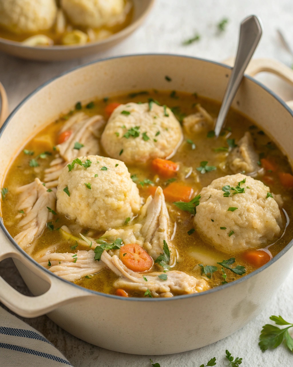 This classic chicken dinner has deep Southern roots, where it’s long been a symbol of comfort and hospitality. Families have passed down their versions for decades, tweaking the recipe to make it their own — but the heart of it always remains the same: tender chicken, rich broth, and homemade dumplings.