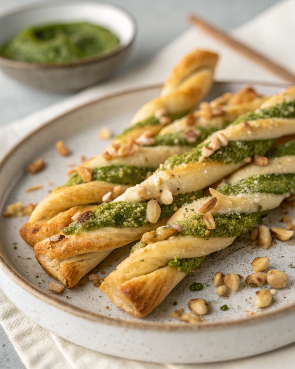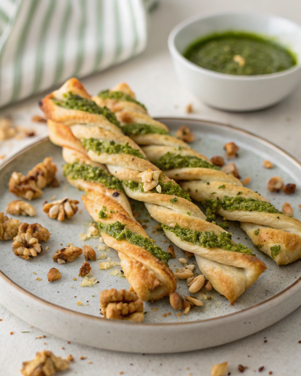 Layering the pastry with pesto, nuts, and cheese, then pressing a second sheet on top, ensures that every twist has flavor throughout. Twisting the strips before baking creates a playful, professional-looking presentation without requiring special tools or skills.