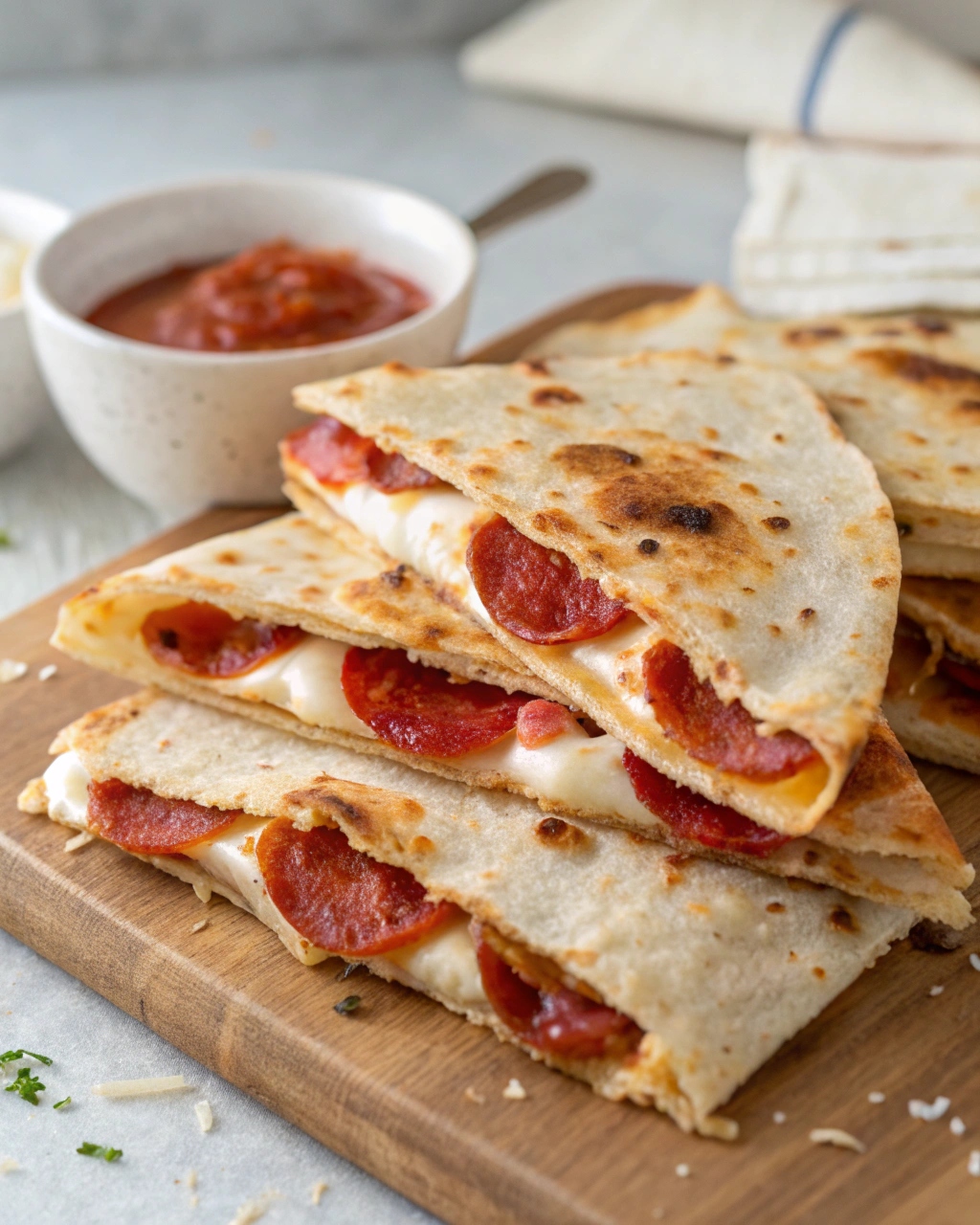 A thin layer of rich pizza sauce delivers that classic Italian-inspired flavor without making the tortillas soggy. Using shredded mozzarella cheese ensures the perfect gooey, stretchy cheese pull that everyone loves in a good pizza recipe. Crispy pan-fried pepperoni adds savory flavor and irresistible texture to every bite.