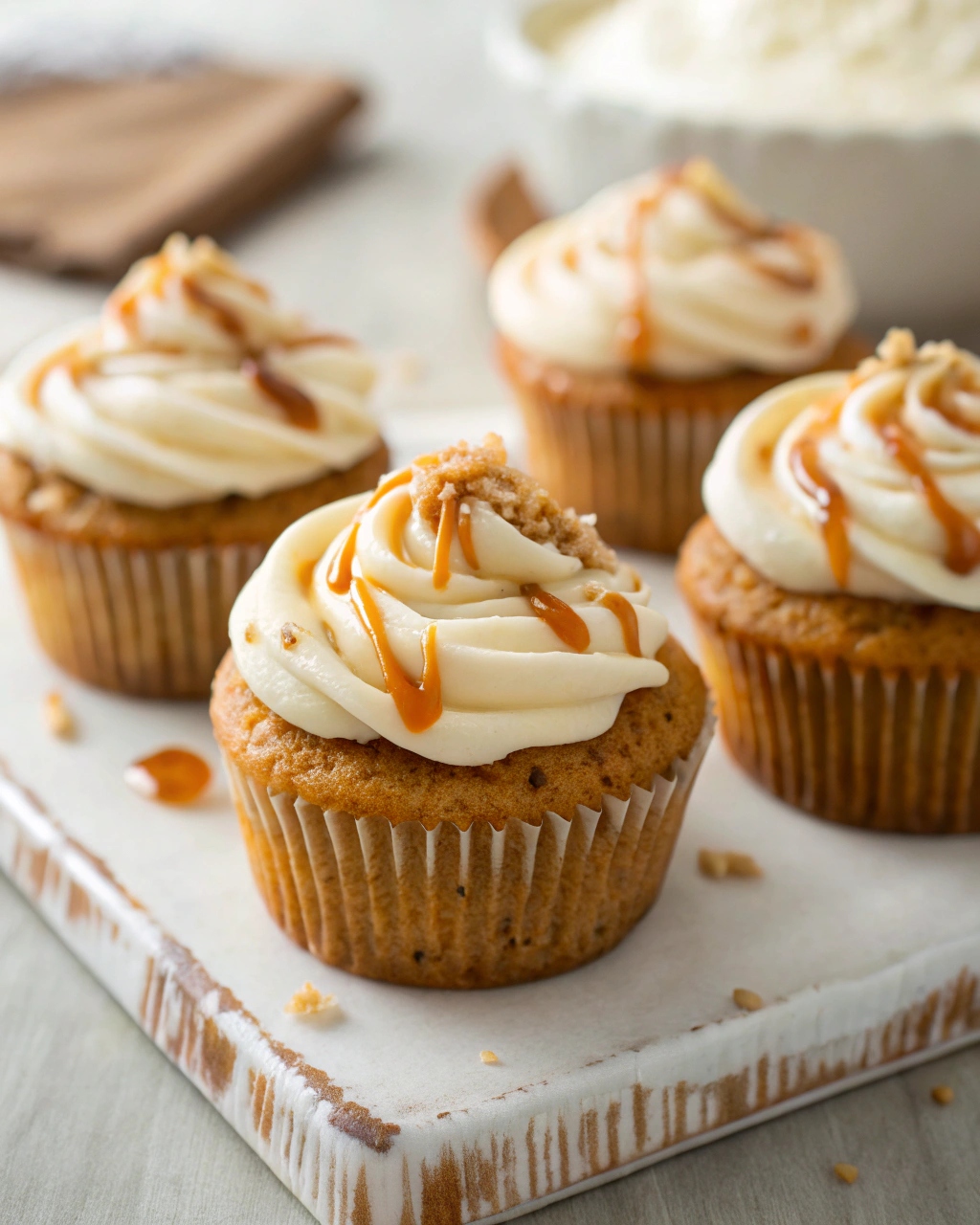 The frosting, though, is where the magic happens. A luscious blend of cream cheese, butter, powdered sugar, and caramel sauce, it’s creamy, slightly tangy, and beautifully sweet — the perfect complement to the pumpkin base. A drizzle of extra caramel on top adds that finishing touch, making these cupcakes look as good as they taste.