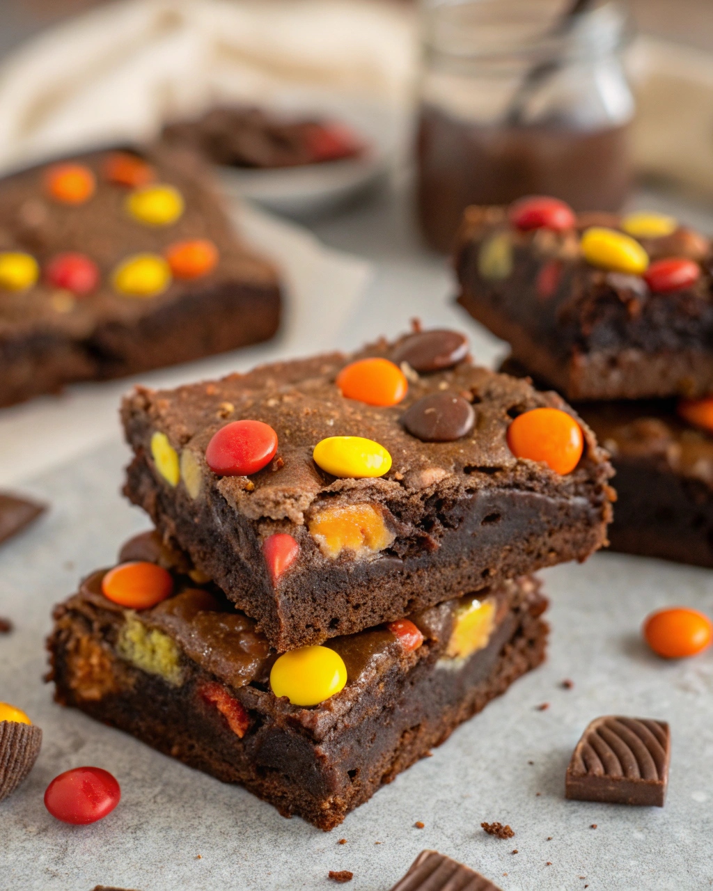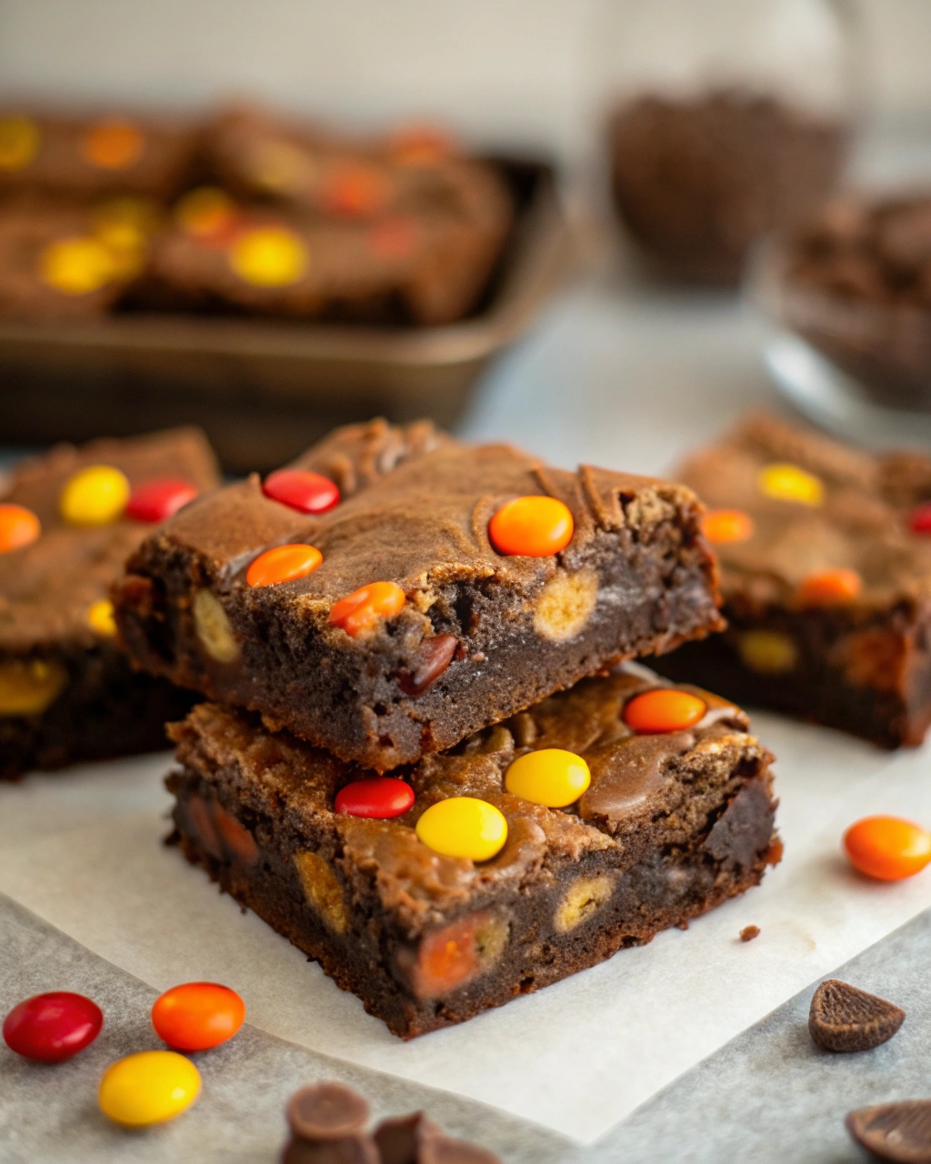 Ingredient-wise, everything here is pantry-friendly. All-purpose flour, unsweetened cocoa powder, vegetable oil, and eggs form the classic brownie base. The oil keeps them soft, the eggs give structure and shine, and cocoa powder provides deep chocolate flavor without making them heavy. Add the peanut butter candies and chips, and you’ve got a no-fail recipe that’s as fun as it is delicious.