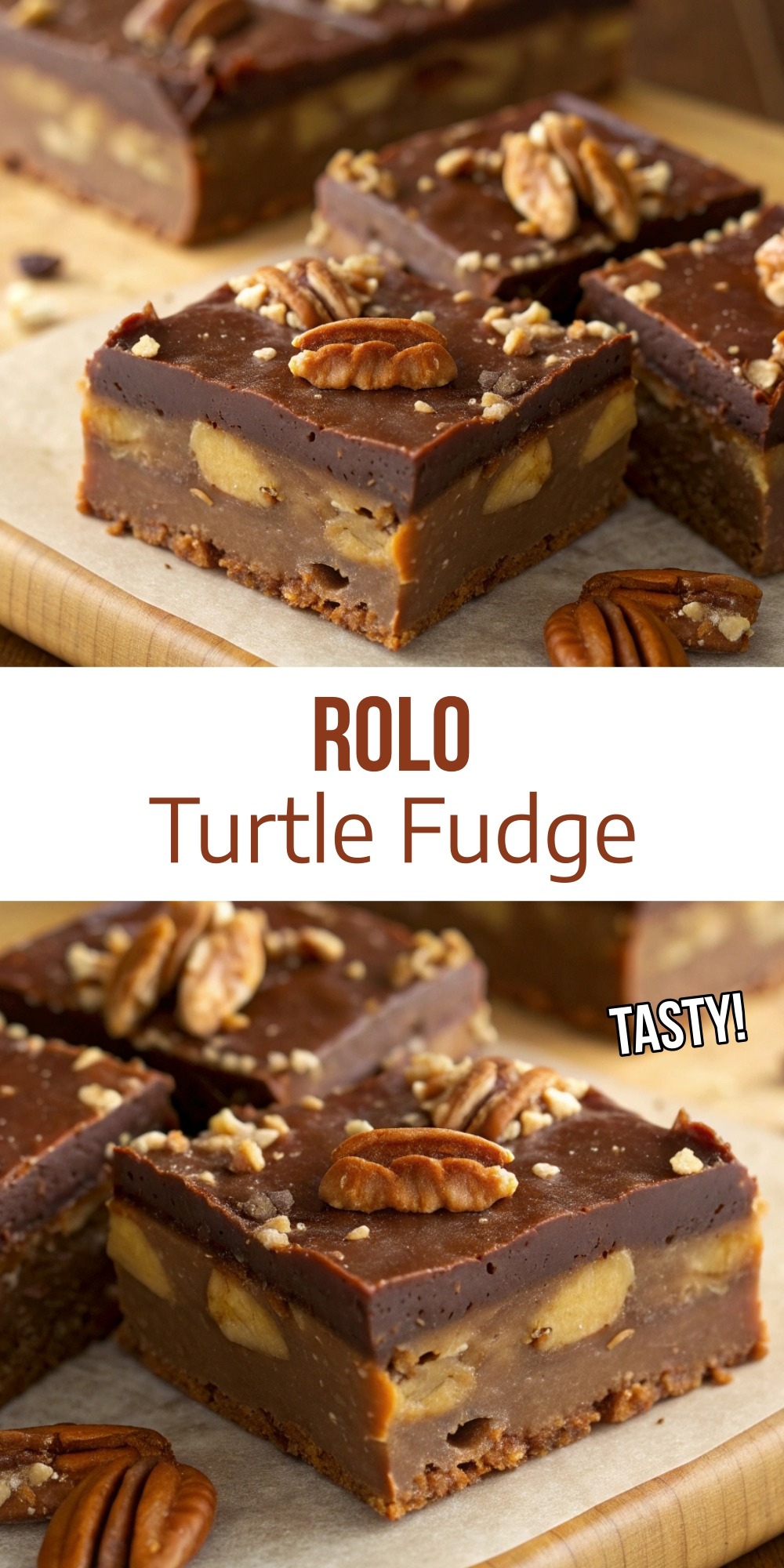 Decadent layered fudge studded with ROLO candies and pecans: rich buttery base, melty chocolate‑marshmallow layer, embedded caramels, and nutty crunch. Cut into squares, this treat is perfect for gifting or indulgent dessert.