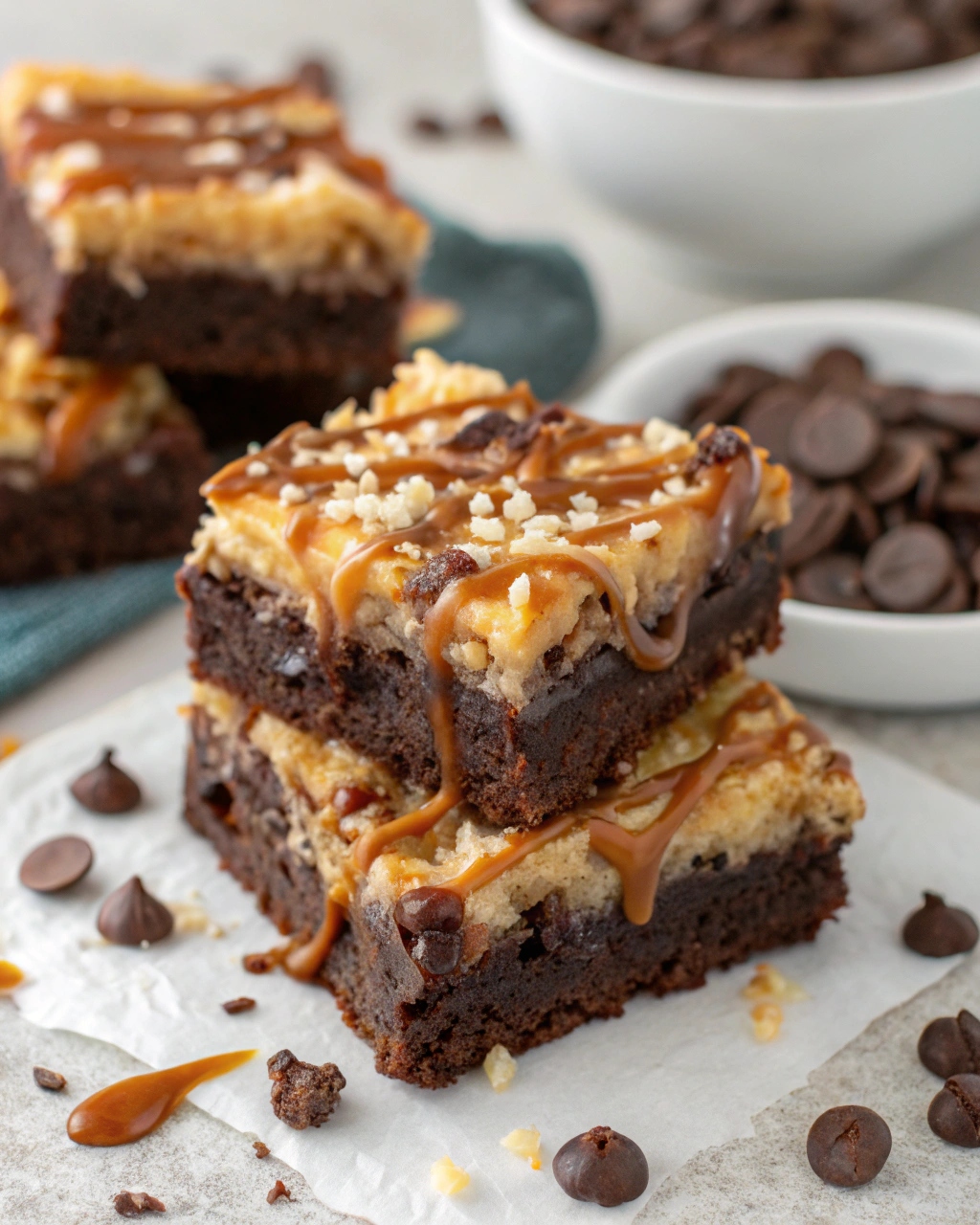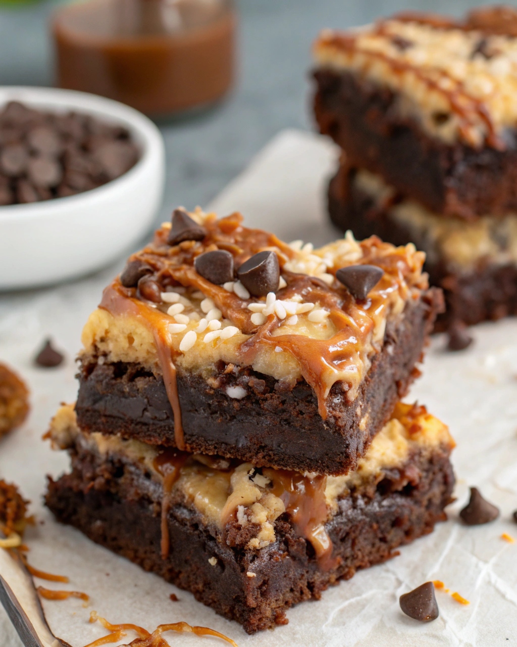 This recipe is also surprisingly simple. The brownie batter is mixed by hand, the toppings melt in the microwave, and the final assembly is as easy as drizzling and sprinkling. No special equipment needed, no fussing with candy thermometers or complicated caramel-making.