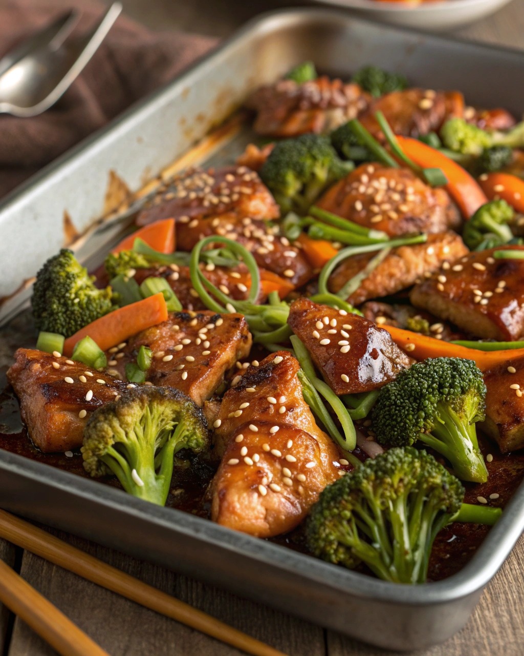 This recipe’s strength is combining familiar teriyaki flavors with ease—no steaming, no separate pan for vegetables, just a single sheet filled with a complete meal. The glaze is adjustable: increase honey for sweeter, more vinegar for brightness, more garlic/ginger for intensity. Use vegetables you like—zucchini, bell peppers, or mushrooms all work.