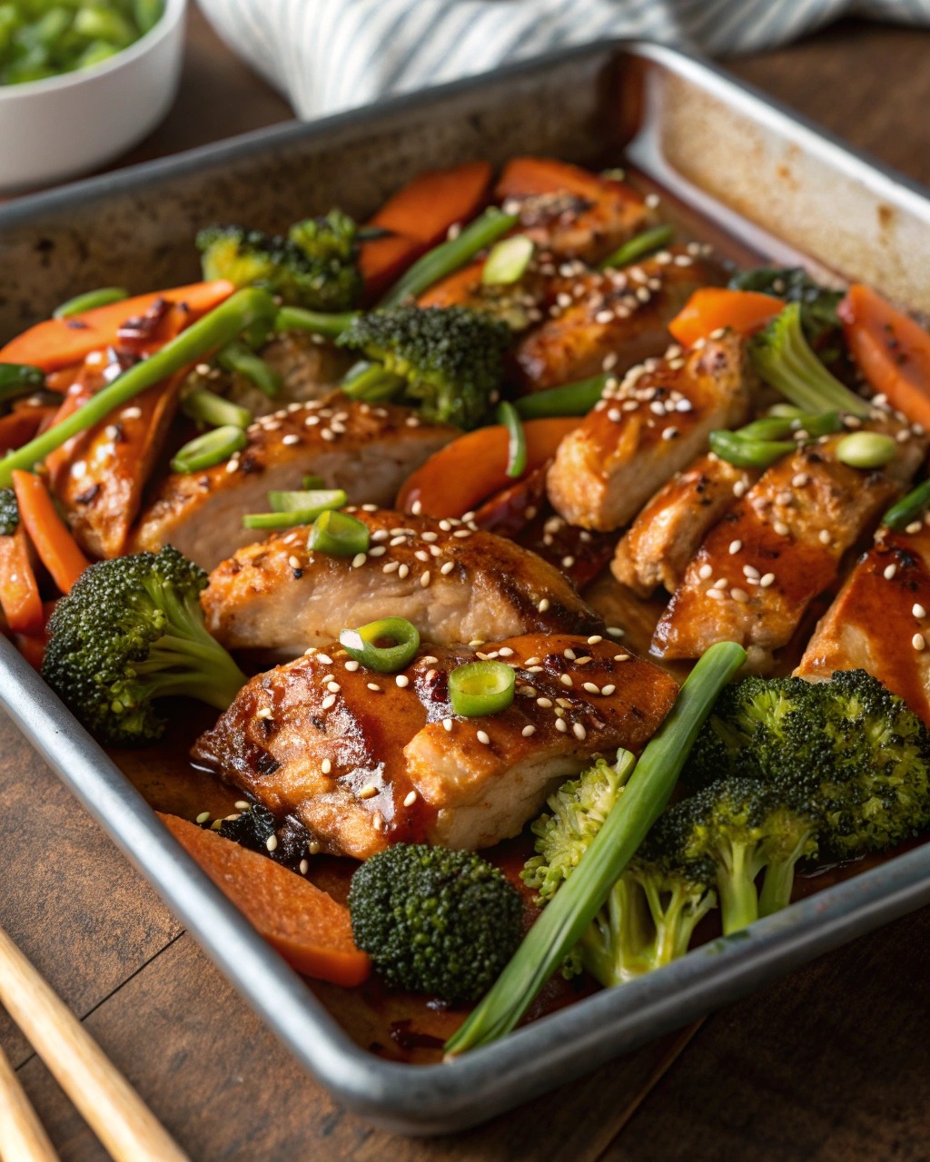 This recipe’s strength is combining familiar teriyaki flavors with ease—no steaming, no separate pan for vegetables, just a single sheet filled with a complete meal. The glaze is adjustable: increase honey for sweeter, more vinegar for brightness, more garlic/ginger for intensity. Use vegetables you like—zucchini, bell peppers, or mushrooms all work.
