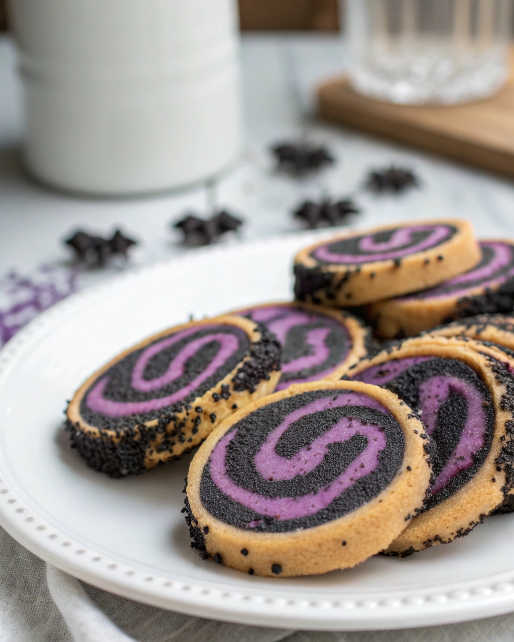 When you cut through the dough, you’ll see the mesmerizing swirl pattern — each cookie looking like a little Halloween galaxy! Once baked, the edges are coated with black sugar sprinkles for extra sparkle and texture. Every bite delivers a buttery crunch with a hint of vanilla and just the right amount of festive fun.