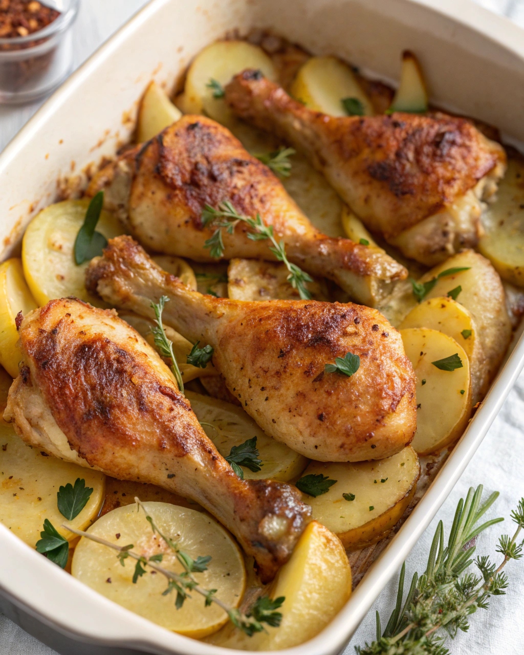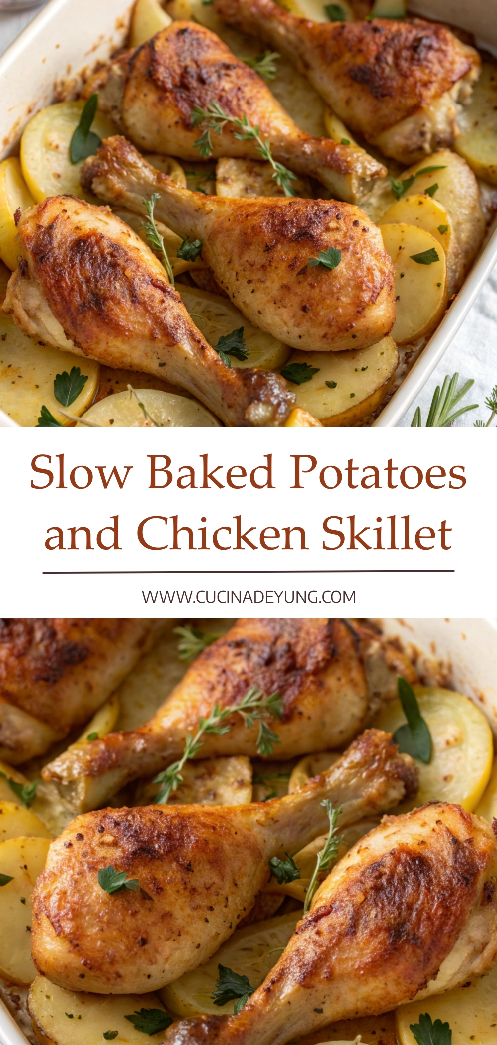 This slow baked chicken and potatoes skillet is a rustic, comforting dish made with tender chicken drumsticks, thinly sliced potatoes, onions, and fresh herbs. Slowly baked to perfection, it delivers deep flavor, soft textures, and golden, crispy edges in every bite.
