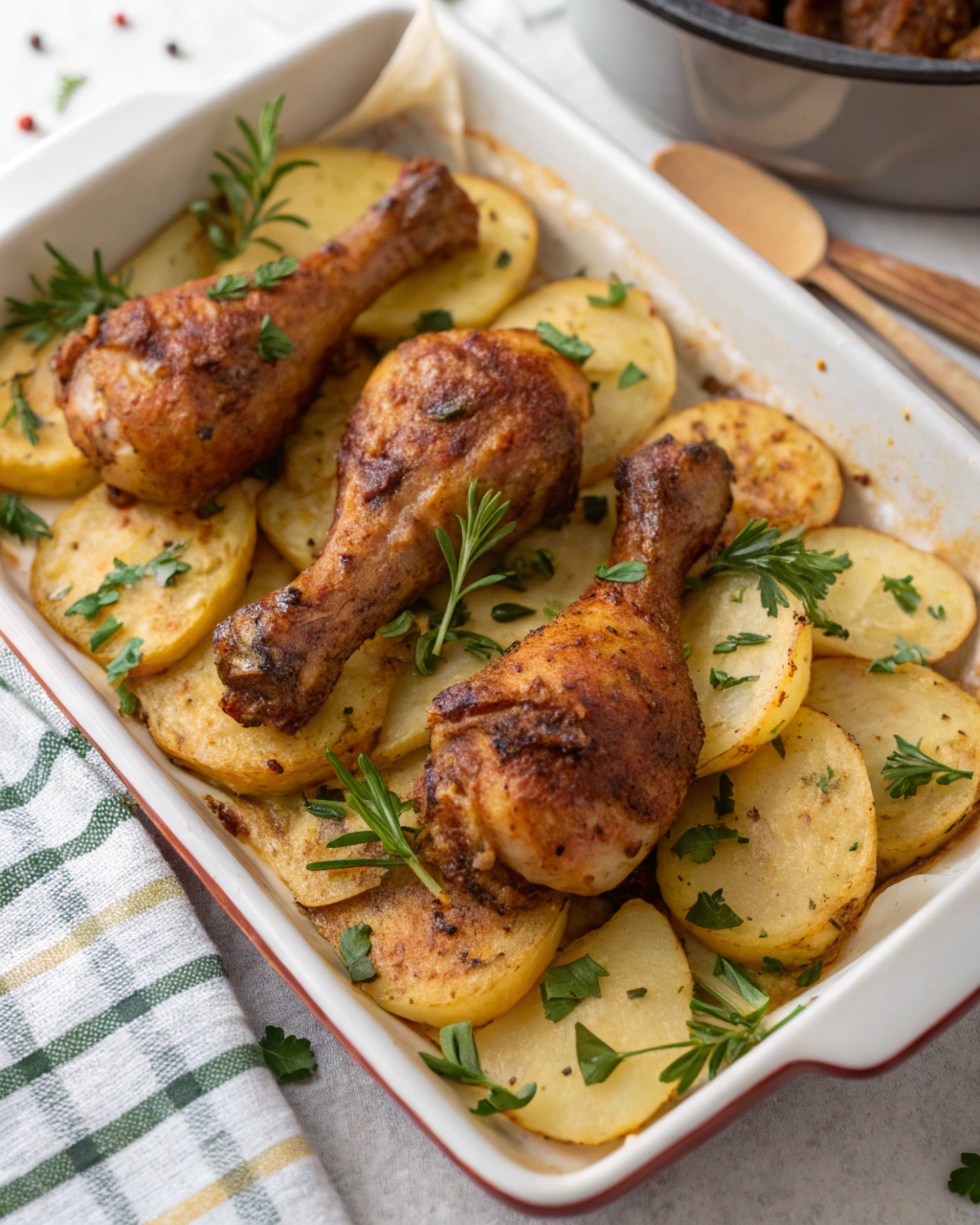 Using chicken drumsticks keeps the dish juicy and flavorful. As they cook, they release their juices into the potatoes below.
