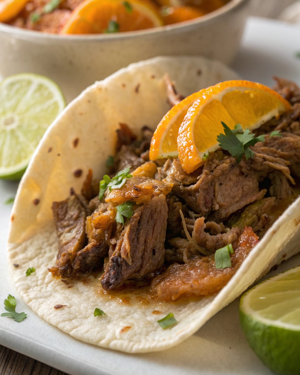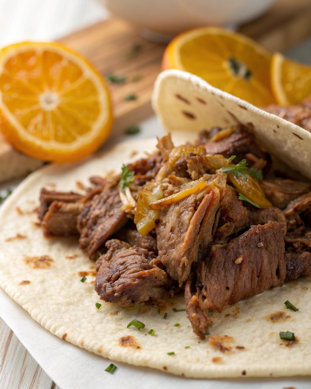 The secret to great carnitas lies in balance: savory spice, subtle heat, and a hint of citrus brightness. The beef soaks up a flavorful blend of orange juice, lime, and lemon, paired with garlic, chili powder, oregano, and cumin for warmth and depth.