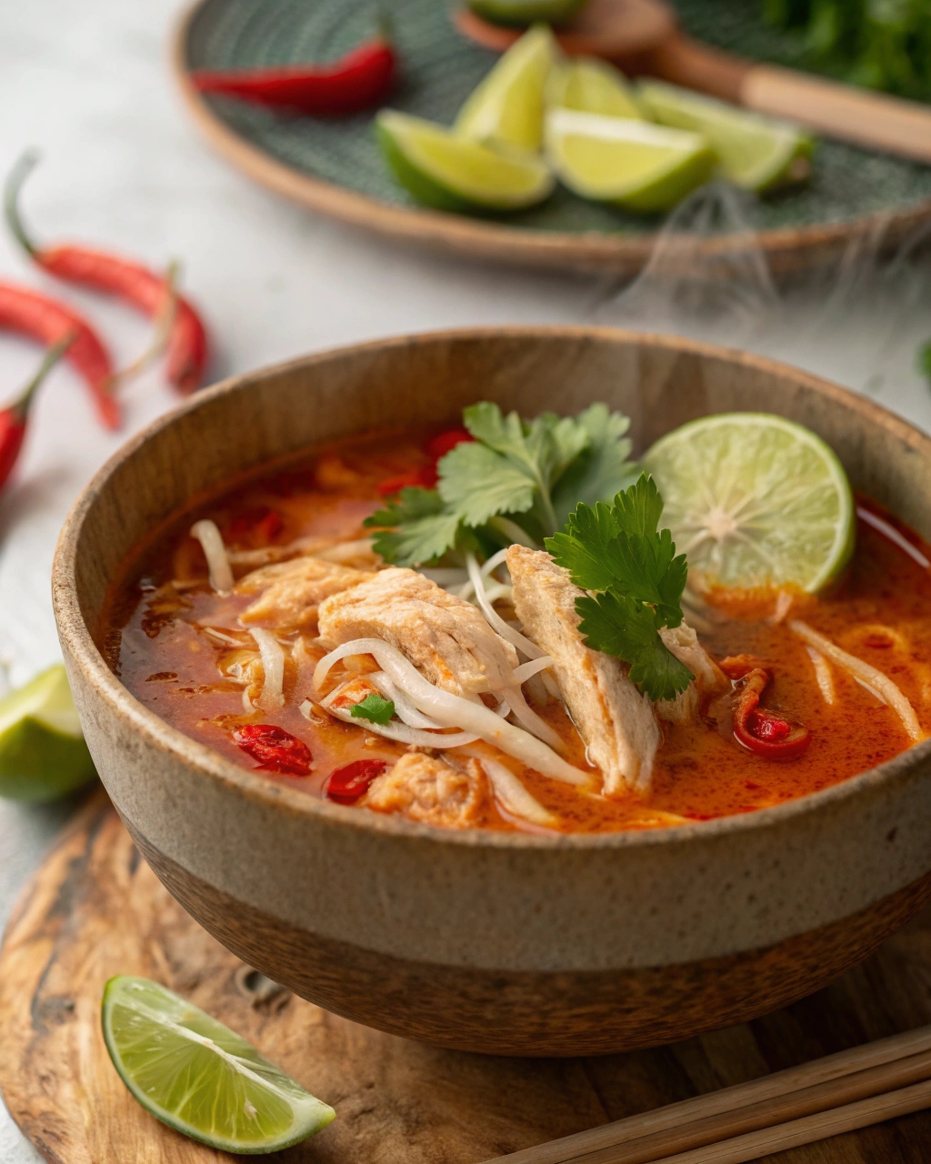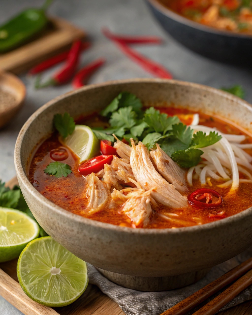 This Spicy Thai Chicken Noodle Soup is a bowl of pure comfort — warming, aromatic, and bursting with Southeast Asian flavors. Made with tender shredded chicken, rice noodles, coconut milk, lemongrass, and red curry paste, this soup is the perfect blend of spicy, creamy, and tangy. It’s a healthy, hearty, and flavorful recipe that’s ideal for cold days, cozy dinners, or when you crave something nourishing yet vibrant.