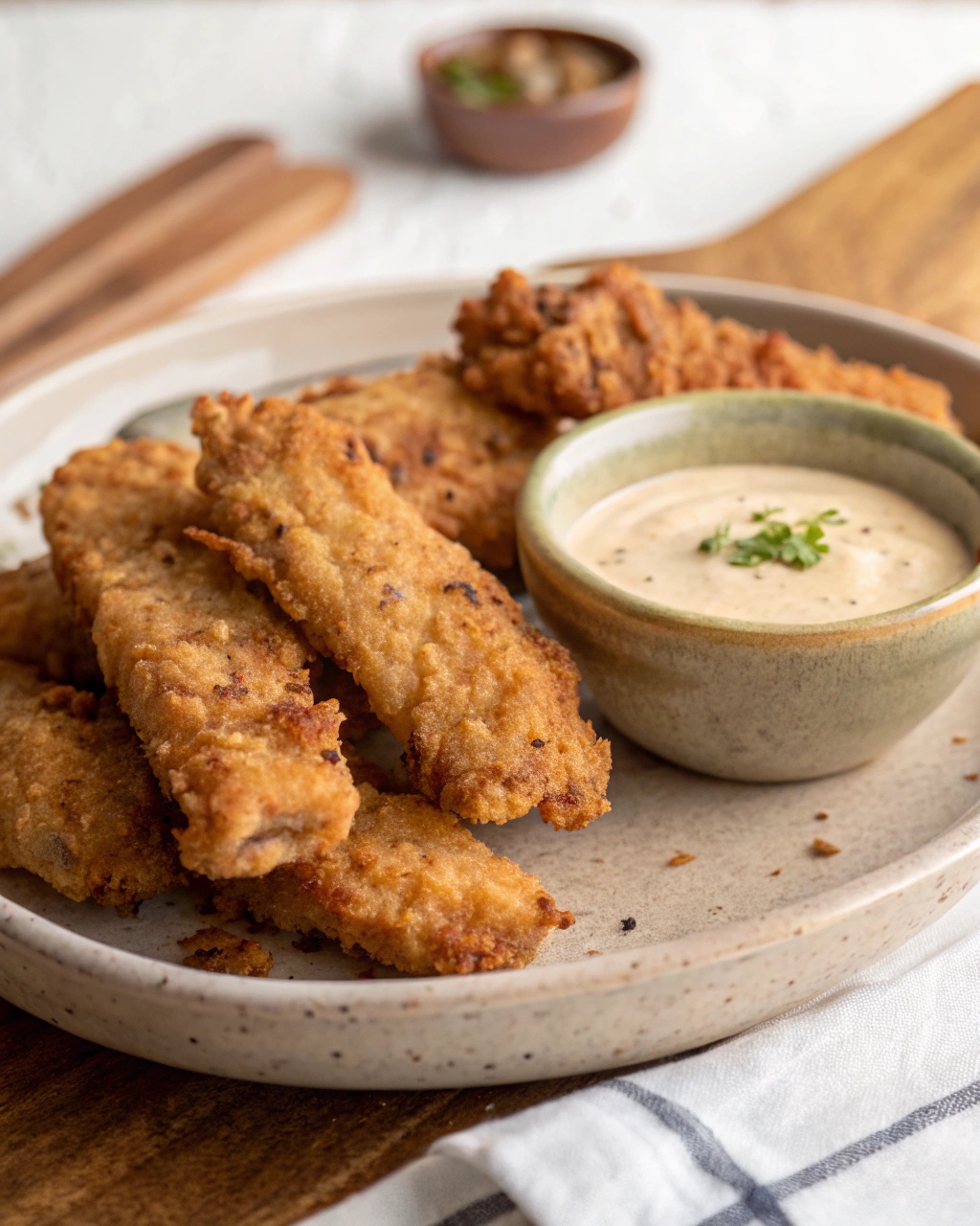 Crowding the pan lowers oil temperature, making the coating soggy. Fry 6–8 strips at a time for best results. 6. Keep finished strips warm