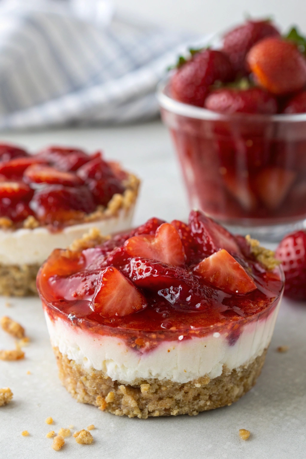 The strawberry gelatin topping adds brightness and freshness. Using frozen strawberries helps the gelatin set faster and distributes fruit evenly throughout each cup.