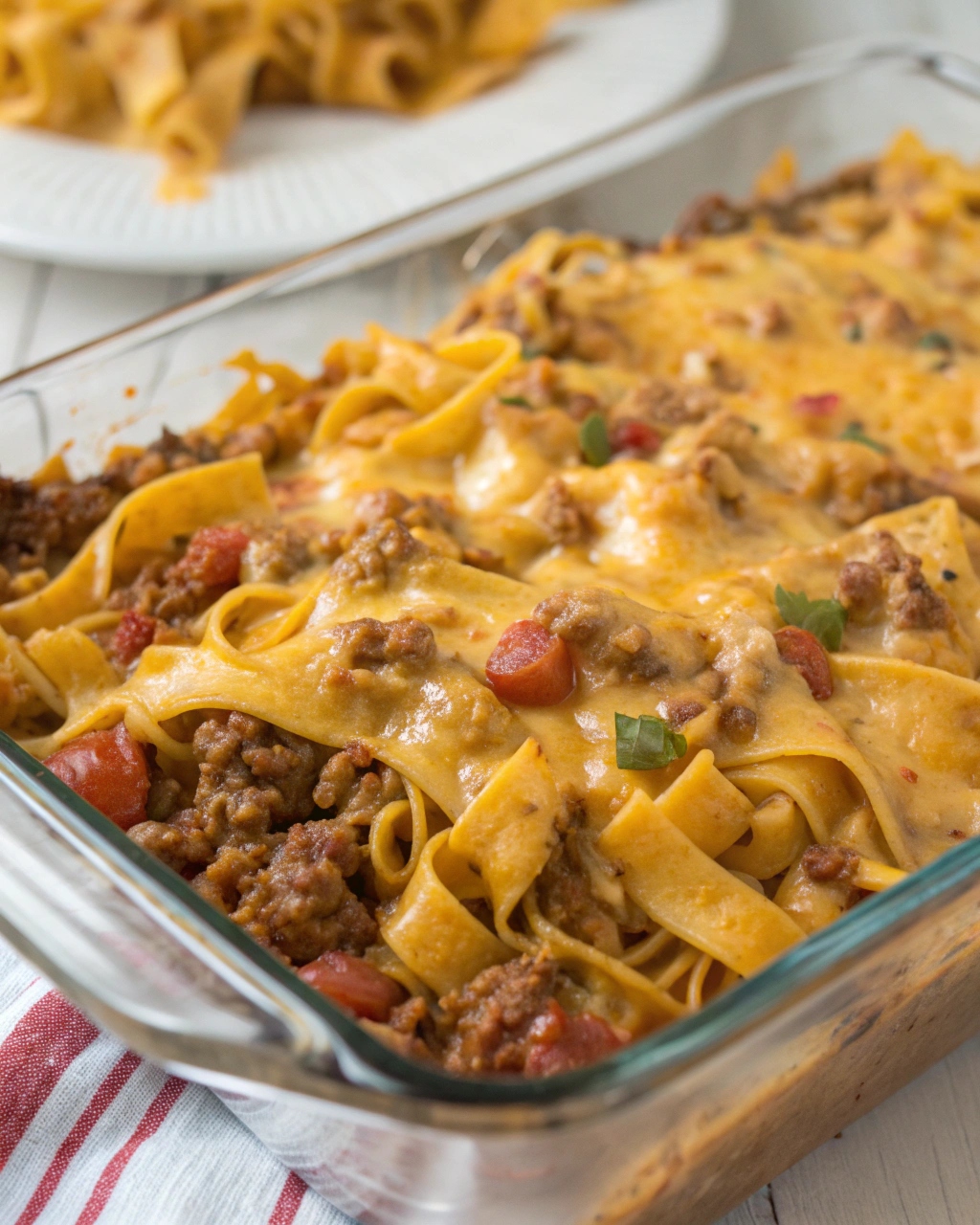Taco Noodle Bake is a hearty, cheesy casserole that combines the bold flavors of classic beef tacos with tender egg noodles and creamy cheese sauce. Made with seasoned ground beef, Rotel tomatoes with green chiles, sour cream, and plenty of cheddar cheese, this baked pasta dish is easy to prepare, family-friendly, and perfect for busy weeknights, potlucks, or make-ahead meals.