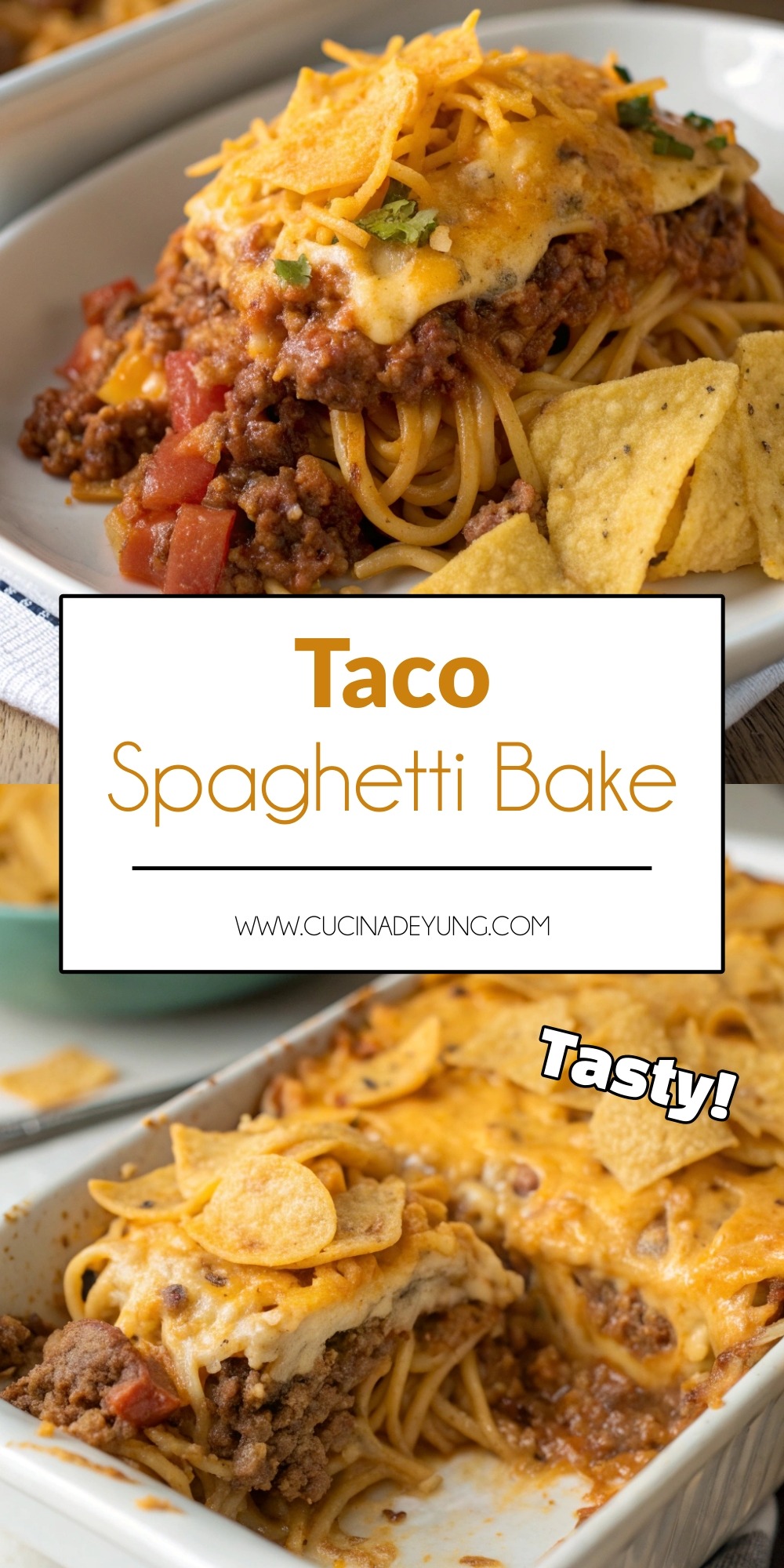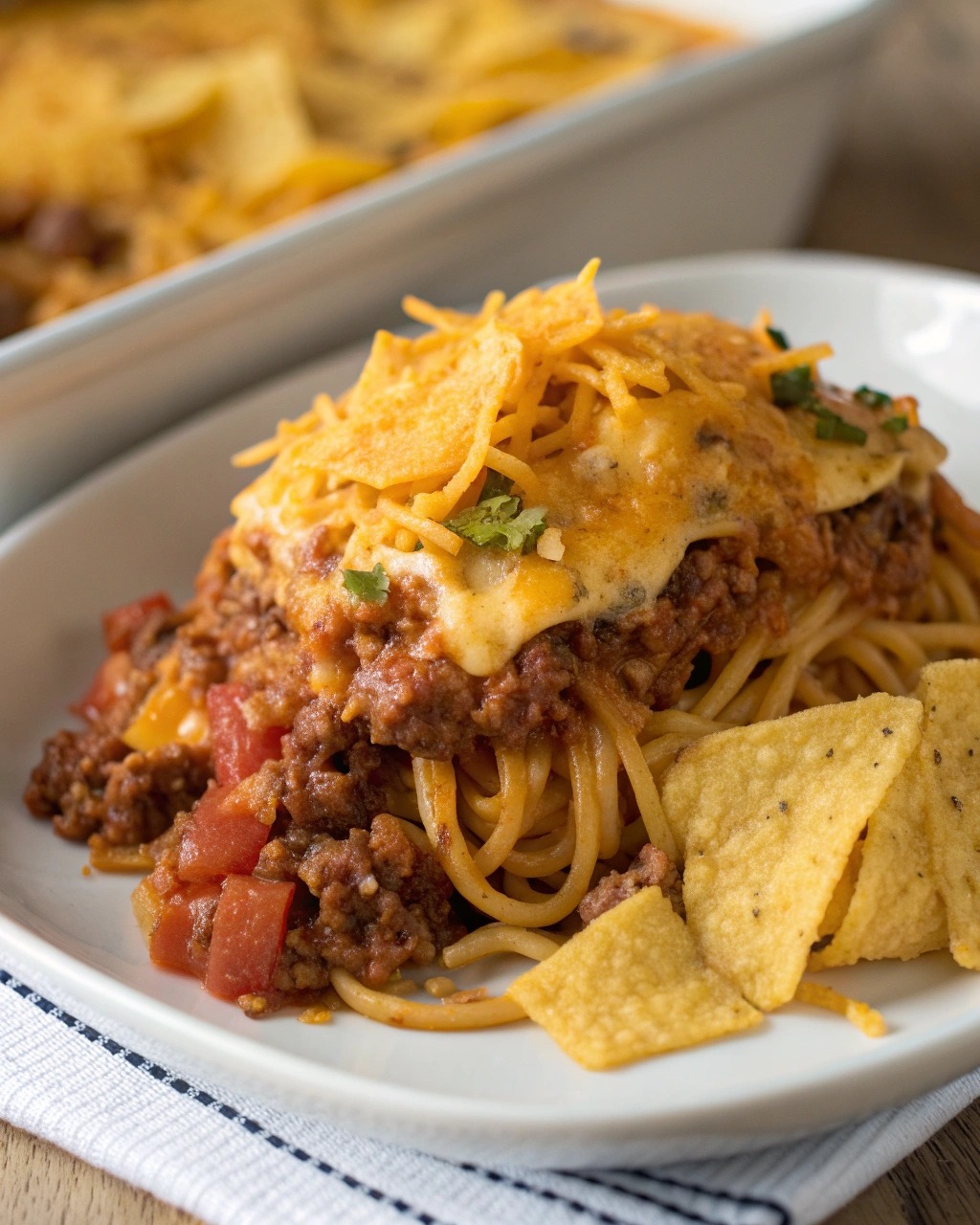 This Taco Spaghetti Bake combines everything you love about taco night and pasta night in one bubbling, cheesy casserole. Ground beef, taco seasoning, corn, creamy sauce, and crunchy chips — it’s a flavor-packed meal the whole family will crave.