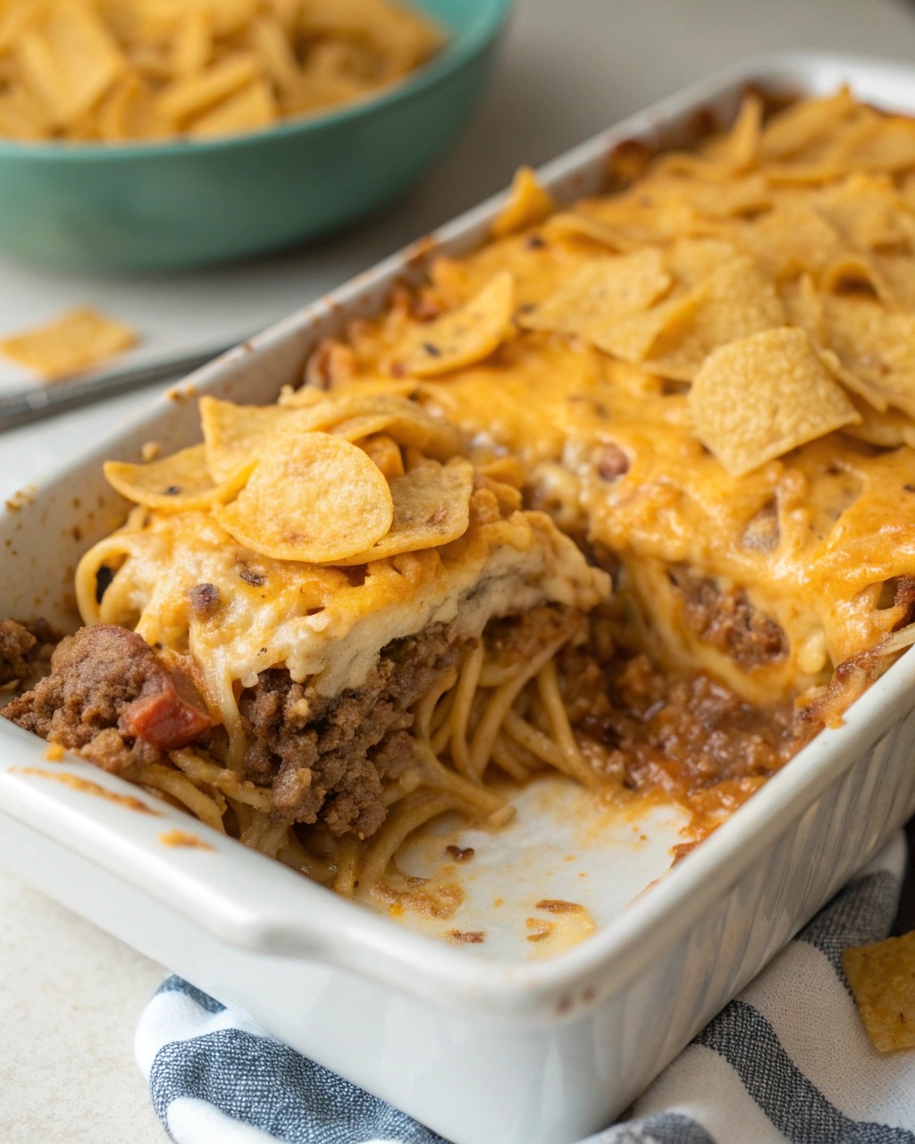 Some nights, you just want to throw something in the oven that’ll make everyone happy. This Taco Spaghetti Bake is built for those nights. It takes all the best parts of tacos — seasoned beef, corn, salsa, cheese, and crunch — and folds them into a creamy spaghetti casserole that’s equal parts fun and filling.