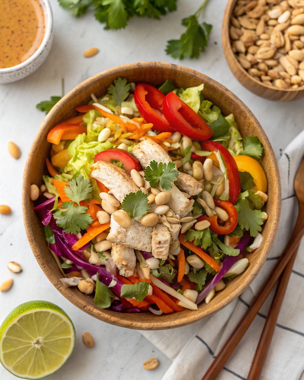 What makes this recipe especially appealing is how easy and versatile it is. You can customize it with your favorite greens, swap the chicken for shrimp or tofu, or adjust the spice level to suit your taste. The peanut dressing can also double as a dip for spring rolls or a sauce for noodle bowls — it’s that good.