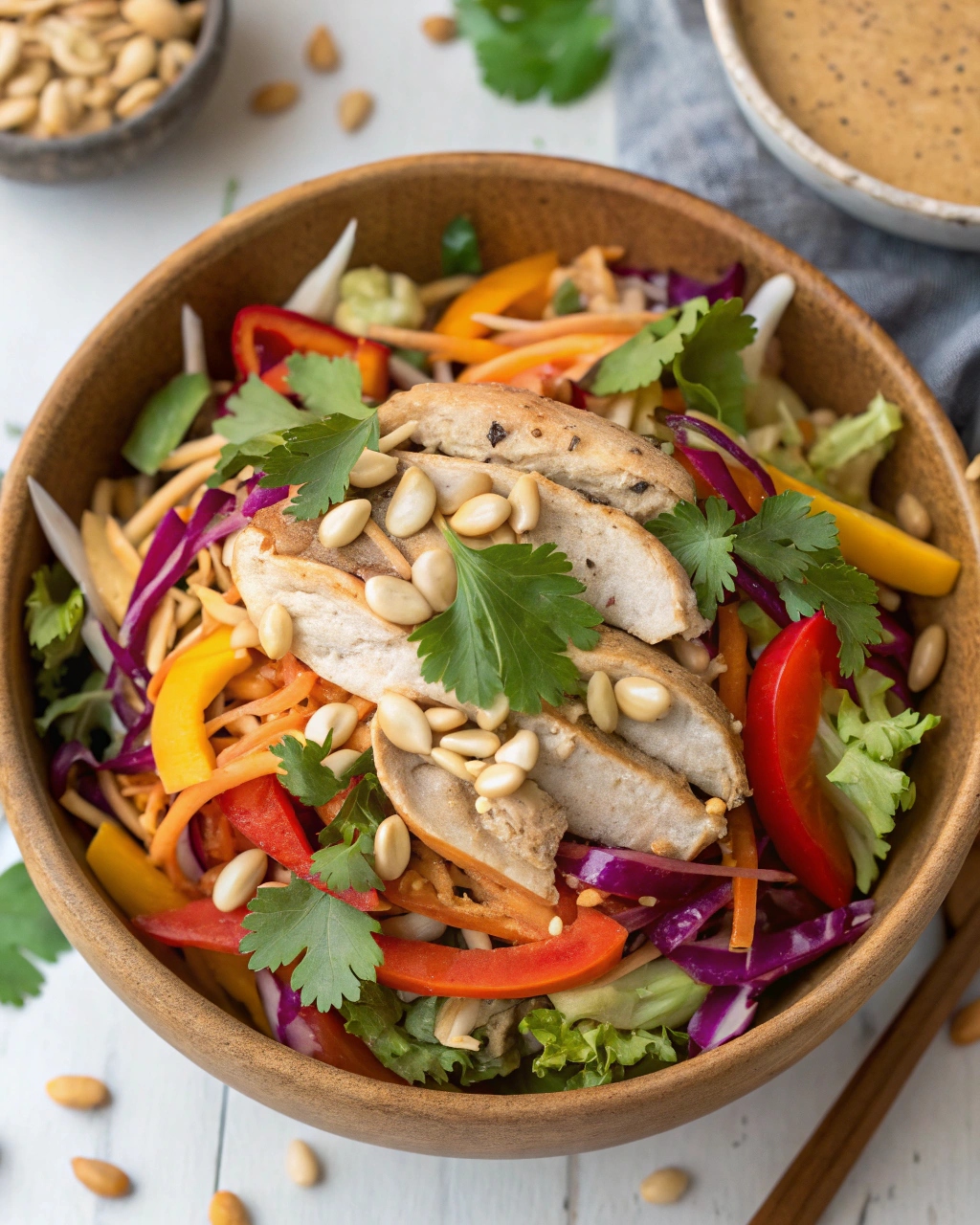But the real magic of this dish comes from the creamy peanut dressing — a luscious blend of peanut butter, soy sauce, honey, rice vinegar, sesame oil, and a splash of sriracha. It strikes a beautiful balance between savory, sweet, tangy, and spicy, coating every piece of chicken and veggie in rich, nutty flavor. With each forkful, you get that satisfying crunch followed by a burst of creaminess and a hint of heat — exactly what a Thai-inspired salad should be.