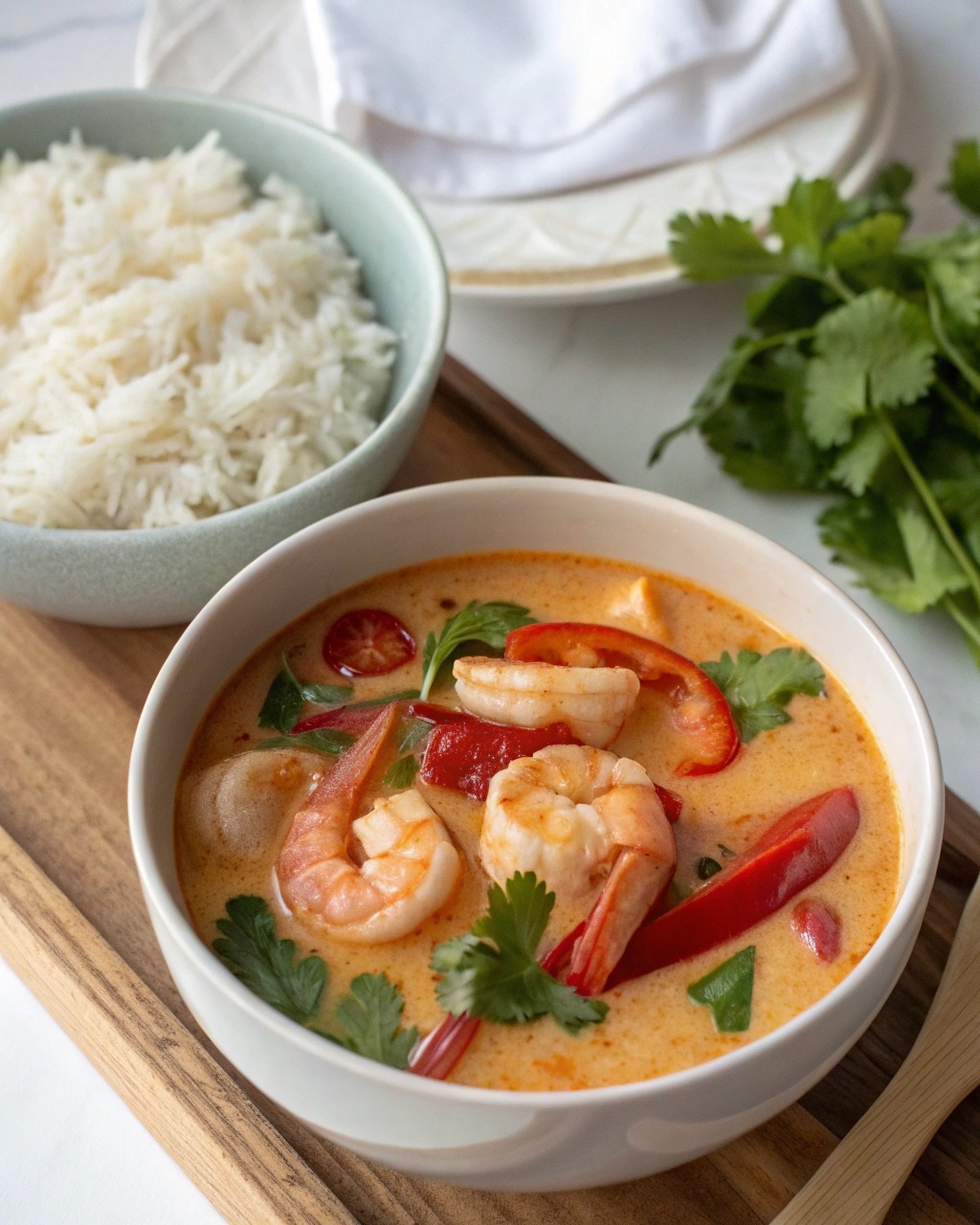 This version focuses on balance: the creamy richness of coconut milk is offset by the heat of red curry paste and the brightness of fresh lime. Add in tender shrimp and soft basmati rice, and you’ve got a soup that eats like a full meal.