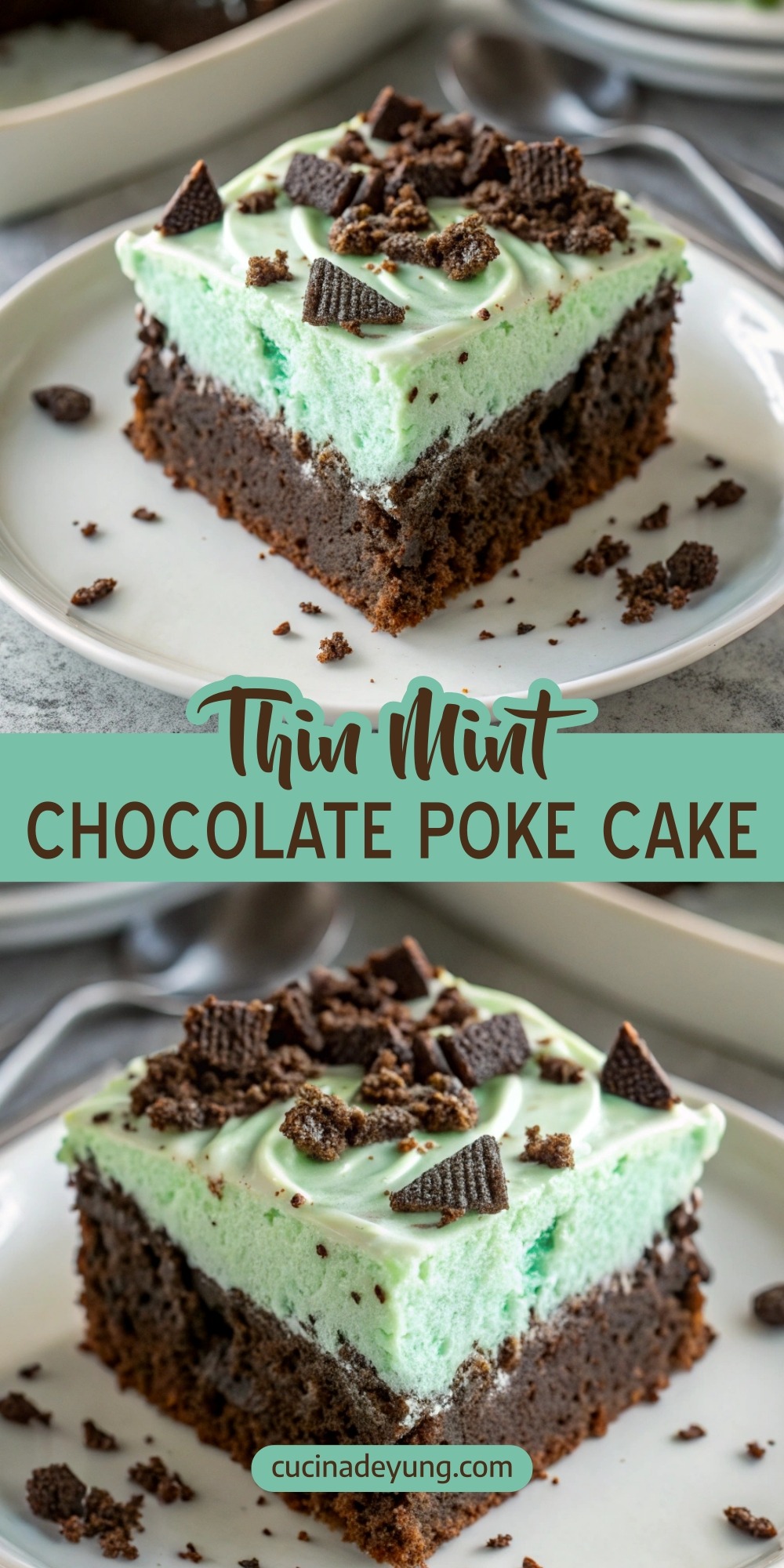 A devil’s food cake poked and soaked with chocolate pudding, layered with peppermint‑flavored whipped topping, and topped with crushed Thin Mint cookies—a minty, chocolatey delight.