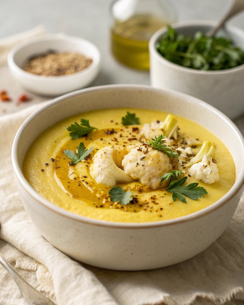 This Turmeric Cauliflower Soup is the ultimate cozy comfort bowl — creamy, vibrant, and full of flavor. It combines the earthiness of roasted cauliflower with the warmth of turmeric and cumin for a nourishing, golden soup that’s both healthy and satisfying. Naturally creamy from the cauliflower and lentils, this dairy-free soup makes a perfect light meal or elegant starter, offering a wholesome boost of flavor and nutrition in every spoonful.