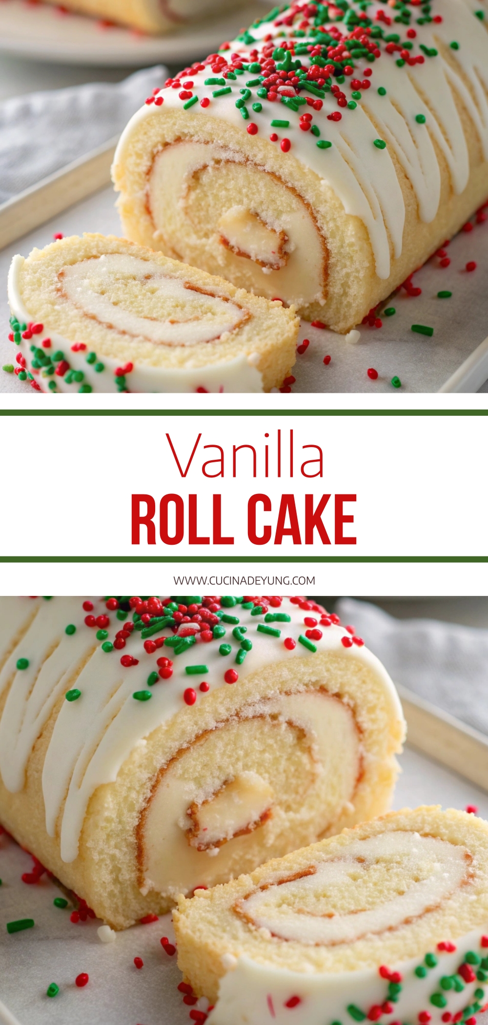 This Vanilla Roll Cake is a beautifully light and airy dessert made from a delicate sponge cake rolled with rich vanilla buttercream, creating the perfect combination of softness and creaminess. Festive touches like colorful sprinkles and a smooth white chocolate topping make it ideal for holidays, celebrations, or any occasion when you want a show-stopping treat. The recipe is surprisingly simple, bakes in minutes, and delivers a bakery-quality roll cake with a tender crumb and eye-catching presentation.