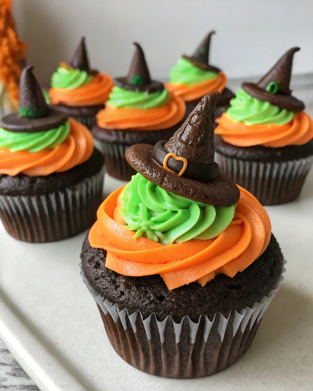 These cupcakes bring the Halloween spirit to life — rich chocolate flavor, creamy frosting, and that playful witch-hat topper that steals the show. They’re quick to assemble, easy for kids to help decorate, and guaranteed to impress at parties, bake sales, or school events. Plus, you can customize the frosting colors for any spooky theme you like!